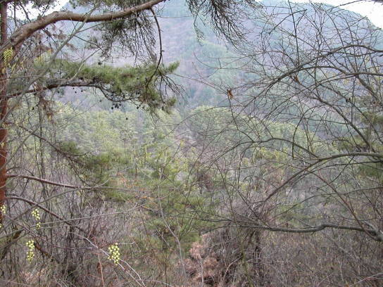 要害城から熊城を臨む(真ん中の緑の淡い峰)。 |