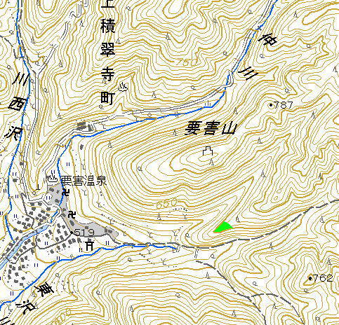 <手記> 熊城は、要害山の南東の痩せ尾根に連続的に曲輪と堀切・竪堀を配したもので、要害城から 見てやや奥まったところに位置しています。 前掲『日本の中世城館』では曲輪間の深い堀切の存在から、要害城裏手への侵入を防ぐ目的 と推察されて、現地案内板ではこの峰のさらに南側にある東沢川の水源を抑えていたと推測し ています。私としては、別城として配置された熊城の位置関係や、比較的大きな建物が存在して いたとされることから、後者の推測の方が説得力を持つように思います。 |