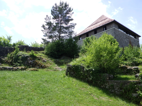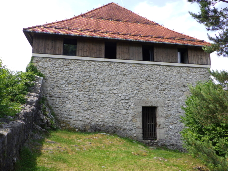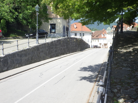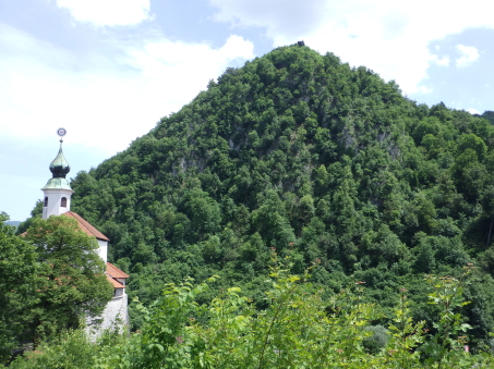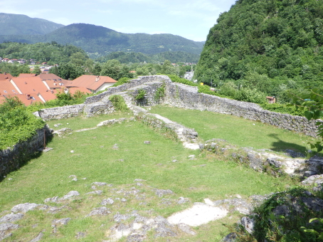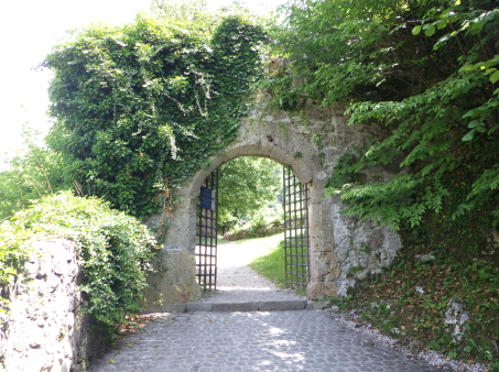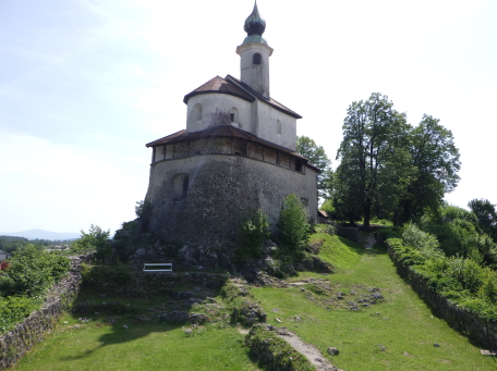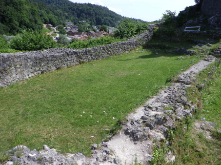 <沿革> クライン辺境伯でもあったメラーン公ベルトルトが、1202年にカムニークの2つの城を抵当に 入れたとするのが史料上の初出とされる。この2つの城とは、小城と古城を指すと考えられて いる。城内に建つ聖エリギウス礼拝堂は、11世紀末~12世紀初頭ごろに建てられたと推定 されており、城も12世紀中に築かれていたとみられる。 13世紀には礼拝堂が2階建てに増築されたが、同世紀末の火災により礼拝堂に隣接する 城の北東部分が焼け落ち、以後再建されることはなかった。残った部分も1511年のイドリヤ 地震で被害を受け、16世紀中に取り壊されたとされる。その後は、城砦として顧みられること はなかったと推測される。 <手記> カムニークはスロベニアの首都リュブリャナから鉄道で北へ40分ほど行ったところにあり、 小城はその旧市街の中心部に位置しています。正面の険しい山上には古城があり、両者で カムニーク・ビストリツァ川を挟み込んでいます。小城はミカヅキモのように細く突き出た峰上 に築かれており、独立丘に見えますが、もともとは西から延びる尾根先だったとみられ、堀切 があったと思われる箇所は切通し道となっています。 城山の東西にはそれぞれ聖エリギウス礼拝堂と防御塔が建っていますが、私が訪れたとき はどちらも立ち入りはできませんでした。礼拝堂は上述の通り歴史が深く、ロマネスク様式の 現存建造物としては、ヨーロッパでも最も古いものの一つなのだそうです。一方の防御塔は、 城砦の遺構を利用してはいるそうですが、史跡というよりモニュメント的な感じに修復されて います。 礼拝堂の北東には、建物の石壁基部が遺跡のように残っています。城跡ファンとしては、 おそらくここが一番の見どころではないでしょうか。また、城山からは北西方向に高々とした 山脈を望むことができ、6月初頭ながら頂上付近は雪で覆われていたのが印象的でした。 城跡だけが目的で訪れたカムニークですが、旧市街も日本の宿場町のようで、なかなか 雰囲気のよい感じでした。小城の最寄り駅はKamnik mesto(カムニーク旧市街)駅ですが、 自分は往復とも中央駅を利用したので、旧市街駅にどれだけの列車が発着しているのかは 分かりません。 |