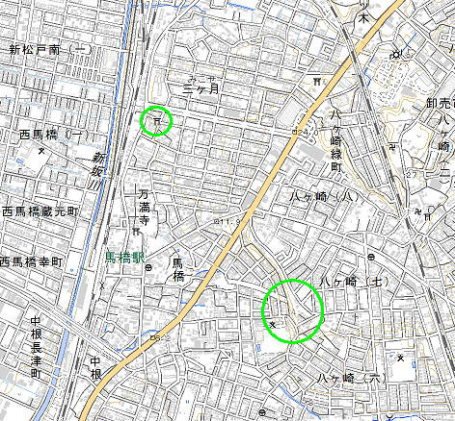 <沿革> 建長八年(1256)、千葉氏当主千葉頼胤が馬橋に大日寺(現在の万満寺)を開山した。 大日寺の北には頼胤の居館「小金屋敷」があったとされ、これが一般に馬橋城のはじまり とされる。 『本土寺過去帳』によれば、文明八年(1476)から明応四年(1495)にかけて、高城安芸 入道・高城孫八・高城安芸入道道友が、それぞれ「間橋」「マハシ」「マバシニテ」没したと あることから、根木内城主高城氏の一族が入っていたものと考えられている。 廃城時期は不明だが、享禄三年(1530)に高城胤吉が小金城を築いて移った後も存続 したとすれば、馬橋城はその支城となっていたものと推測される。 <手記> 馬橋城については、現在大きく2つの比定地が存在します。1つは、馬橋市街地の北の 三日月神社周辺です。『日本城郭大系』ではこちらを馬橋城としていますが、『中世城館 調査報告書集成』では、こちらを「三ヶ月馬橋城」としています。 神社一帯は坂川の河岸段丘にあり、一応の要害地形ではありますが、住宅地として 完全に造成されており、遺構はおろか旧地形をうかがうのも困難です。旧地形図に照らし てみると、かつては三日月神社を西端とする北向きの舌状台地であり、これを利用した 城があった可能性は考えられます。 もう1つの比定地は、松戸第三中学校背後の丘上です。『集成』では、こちらが馬橋城 としています。周辺には「城之腰」の字があったということですが、現在ではこちらも宅地 開発されており、具体的にどこを指すのかは分かりません。遺構もとくにみられません。 こちらの台地は西と南に対してかなり高低差があり、要害性も十分です。 現状では、馬橋城が2つの比定地のうちどちらにあったかを判断する術はありません。 あるいは、どちらにも城砦があったのかもしれません。ただ、馬橋城の前身とされる頼胤 の小金屋敷(現地では小金城と呼ばれることも)については、これらとはまた別の場所に あったのではないかと考えています。というのも、『大系』で鬼門除けと推測されている 蘇羽鷹神社(字違いの曽場鷹神社は千葉氏の本城亥鼻城の鬼門除けとなっている)は、 どちらの比定地に対しても鬼門(北東)とはずれたところに位置しています。神社の南東 にあたるのは、ちょうど大日寺の裏手付近となります。したがって、頼胤の小金屋敷は 三ヶ月神社の南にあたるこの位置にあったと考えるべきではないかと思われます。 |