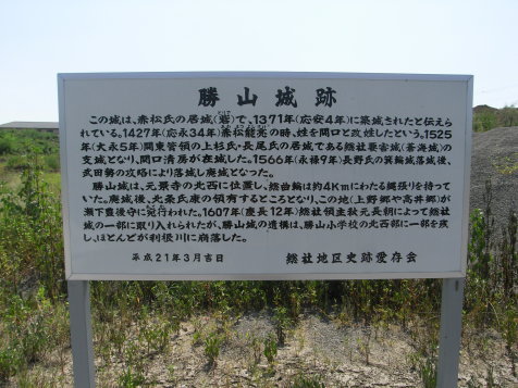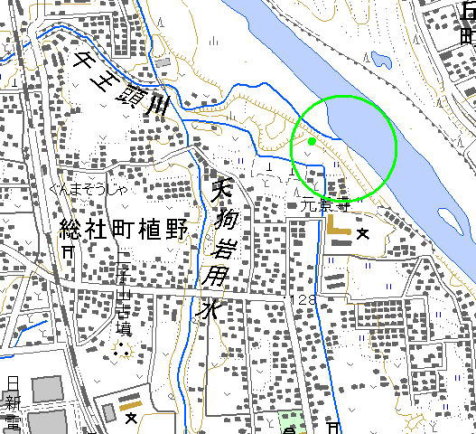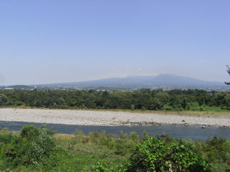<沿革> 現地案内板によれば、赤松氏によって応安四年(1372)に築かれた。赤松能亮のとき、姓を関口 に改めた。赤松氏は、赤松則村(円心)の一族と考えられるが、系譜上どこに位置するかは詳らか でない。 戦国期の関口氏の動向は明らかでないが、16世紀中ごろには、関口清房が関東管領上杉氏に 従っていたとされる。『日本城郭大系』には、城主として関口政次の名が挙げられているが、いつ ごろの人物なのかは不明である。 永禄九年(1566)、武田氏の侵攻により箕輪城の長野氏が滅ぼされると、まもなく勝山城も武田 勢に攻め落とされた。城は、このときに廃城とされた。 時代は下って慶長六年(1601)、関ヶ原の戦いの後に総社1万石を与えられた秋元長朝は、勝山 城跡の南の植野に総社城を築城し、旧勝山城域の一部は総社城内に取り込まれた。 <手記> 城があった場所は、現在の勝山小学校の北側、元景寺の北東側にあたります。利根川のたび重 なる流路変更によって、城のほとんどは川に崩落してしまいました。 勝山城跡に当たる利根川河岸は、現在遊歩道として整備中です。その歩道の一角に、地元愛好 会が立てた案内板があります(上図の点示部付近)。このほかには取り立てて遺構と呼べるような ものは見当たりませんでした。 ただ、城跡から望む赤城山や子持山の景色は非常に素晴らしいものでした。 |