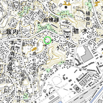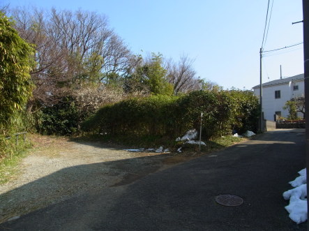 <沿革> 『新編相模国風土記稿』によれば、「二伝寺の艮方に連れり今陸田とす三段余」の地が、天正 (1573〜92)の末に間宮豊前守康俊の住したところとされる。間宮氏は北条氏の重臣で、玉縄 衆に属していた。間宮氏の居城は笹下城とされており、当屋敷は玉縄衆としての役宅か持ち場 であったと推測される。あるいは、二伝寺背後の二伝寺砦の守備を任されていたとも考えられる。 康俊は、天正十八年(1590)の小田原の役に際して山中城を守り、壮烈な討ち死にを遂げた。 『記稿』には、康俊宅址の前に続く陸田に「山田屋舗」の小字が残り、これを山田弾正宅址と する記述もある。ただし、山田弾正なる人物については不明である。 <手記> 二伝寺の艮方(北東)で、藤沢市渡内に属するという『記稿』や『日本城郭大系』の記述から、 上の地図に示した範囲が比定地と思われます。二伝寺砦の丘から舌状にせり出した台地の縁 にあたり、南東の谷戸口には旧鎌倉道とされる二伝寺坂があります。ここに玉縄城の外郭施設 があったということは、十分に想像できます。 すでに陸田は失われ、失礼ながら決して広いとはいえない平坦面の上に、住宅が身を寄せて 並んでいます。今では、康俊宅や山田氏宅の小字が具体的にどこを指すのかを探るのは困難 と思われます。 |