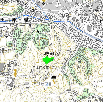 <沿革> 小山田有重の子稲毛三郎重成によって築かれたと伝わる。重成は、稲毛荘を支配し、勢力を橘樹郡 に広げ枡形城を本拠に、また北に小沢城を支城として築いたといわれる。枡形城の北、登城路とされる 暗闇坂の入り口に建つ広福寺は重成の居館跡と伝わる。ただし、これらは全て伝承によるものであり、 確証があるわけではない。 稲毛氏は、元久二年(1205)の畠山重忠の乱に巻き込まれて滅ぼされた。これによって、枡形城は 一旦廃城になったと考えられる。 永正元年(1504)九月二十日、長享の乱に際して扇谷上杉朝良の援軍として出陣した北条早雲 (伊勢宗瑞)は、枡形山(正確には城址か)に陣を張った。翌日には早雲の主筋である今川氏親の軍も 枡形山に到着し、二十七日には山内上杉顕定軍との間で立河原の戦いが行われた。このとき枡形山 はすでに城の体を成してはいなかったと思われるが、おそらく陣城程度には取り立てられたものと推察 される。 永禄十二年(1569)に武田信玄が北条領に攻め込んだ際、横山式部少輔弘成(北条家臣か)が塁を 築いて備えたと、『新編武蔵国風土記稿』にある。『記稿』からは、弘成の子孫が当地で名主を務めた ことが読み取れ、弘成以降も枡形城下に居を営んだものとも考えられる。 <手記> 枡形城は、生田緑地に隣接していることや向ヶ丘遊園に近いことから、周辺では比較的知られた城跡 です。ただし、知名度の割には遺構は判然とせず、山頂は城跡にしては少々だだっ広い広場となってい ます。おそらくは、きちんと縄張りをして整備した城郭ではなく、臨時に立て籠もる砦程度のものであった と推測されます。 広場には、城址碑や微妙に城郭風のエレベータ付き展望台があります。展望台からの眺望はさすがに すばらしいですが、当時より明らかに高い位置からの眺めですので、中世城郭ファンとしては素直に喜べ ない代物でした。 枡形山の北東の飯室山にも曲輪が設けられていたとする向きもありますが、いかんせん遺構がはっきり しないので、何ともいえない感じでした。この飯室山と枡形山を結ぶ尾根道と、城の北から登る暗闇坂が 当時の登城路と思われますが、2つとも山頂広場の手前で道幅が狭まり、道の両側が削られたように切り 立っています。もしかしたら、土橋状に道の両岸を人為的に削ったのかもしれません。 暗闇坂の入り口には稲毛重成の居館跡と伝わる広福寺があります。ただ、私には寺がそのまま館跡と はちょっと思えません。広福寺は細尾根の上にあり、どちらかといえば寺の両脇の谷間の方が、当時の 館地形として相応しいように思われます。 |