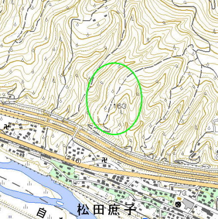 <沿革> 相模国波多野荘の領主波多野氏は、平安末期に勢力を広げ松田郷にも所領を拡大した。 源頼朝挙兵に際して合力を求められた波多野義常は、拒否したため討手を差し向けられて 自害した。その子有常は、後に流鏑馬の腕を認められ、父の旧領から松田郷を与えられた。 波多野荘は叔父の義景が継ぎ、有常は松田氏を称した。 松田城がいつごろ築かれたのかは定かでない。南北朝時代、松田氏は河村城の河村氏 らとともに南朝方についたといわれる。河村城が北朝方との戦場となったため、松田郷も巻き 込まれた可能性はあるが、詳しいことは分かっていない。 その後、松田氏は分散していった。明応四年(1495)に北条早雲(伊勢宗瑞)が小田原城 を奪取すると(奪取年には異説あり)、旧城主大森氏と対立していた松田頼秀は、北条氏に 従った。頼秀は惣領家ではなく、備前国に移り住み幕府に仕えていた備前松田氏の一族で、 幕府の命により関東へ下向していた。 松田氏は最終的に、筆頭家老として北条家中最高の禄高を食むに至った。『新編相模国 風土記稿』によれば、松田城は松田新次郎康隆の持ち城とされている。康隆は頼秀の孫と いわれ、松田城の他にも深沢城や湯ノ沢城の城主を務めていたとされるが、詳しい事跡は 不明である。 康隆の兄ないし従兄弟に、天正十八年(1590)の小田原の役で豊臣秀吉に通じようとして 監禁された松田憲秀がいるが、松田城主であったかは詳らかでない。同役で北条氏が滅亡 すると、憲秀は秀吉に自害を命じられた。これにより、松田城も廃城となったと思われる。 <手記> 丹沢山地の南端に大きく張り出した山塊の南側斜面、いくつもの沢に区切られた峰の1つ が松田城址です。南には酒匂川を挟んで、小田原湾までの平野部の眺望が広がります。 右手には富士山も間近に望めます。 城は、天神沢と旗矢沢に挟まれた細尾根を利用したもので、連郭式に曲輪が並んでいた ものと推測されています。城跡一帯は蜜柑畑となっていて、雛壇状に削平地が並んでいる ものの、畑地化によるものか城の遺構なのか判然としません。ただ、大きく分けると主郭部 と堀切を挟んだ前曲輪部、そして主郭背後の後曲輪部の3つに分類することができます。 城内の遺構でもっともはっきりしているのは、主郭部と前曲輪部の間の堀切です。 |