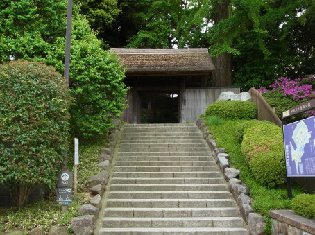 | 戸定邸入口の門。 手前の階段は戦後に土地を削ったものだそうで、 かつてはずっと緩やかな坂道だったそうです。 |