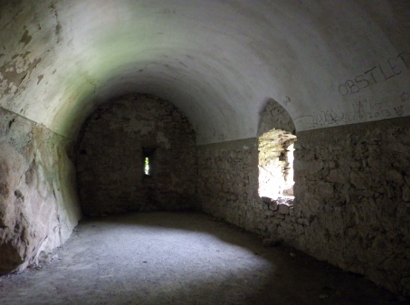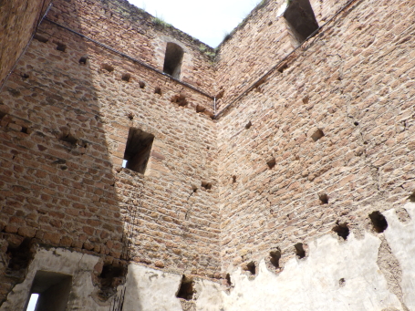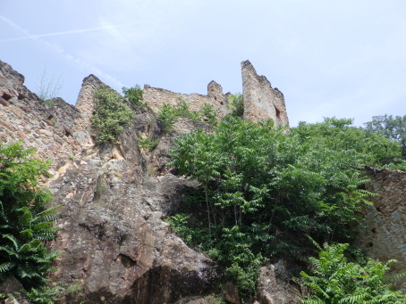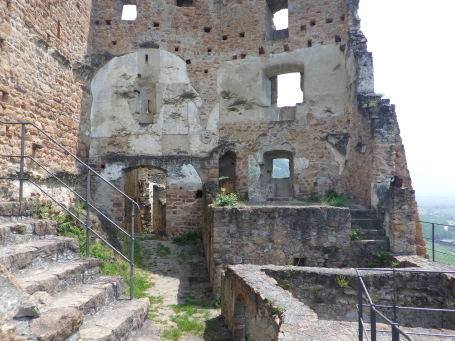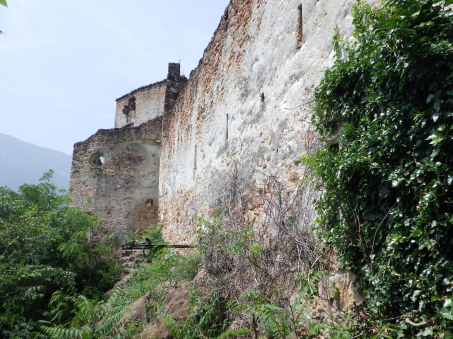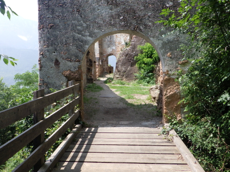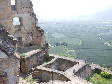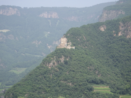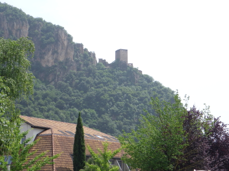 <沿革> 13世紀初めごろに、チロル伯によってボーツェン(ボルツァーノ)方面の備えとして築かれたと 考えられている。史料上は、1228年に「Nova Domus(ノイハウスと同義)」として見られるのが 初出である。初期の城には居住用の建物がなく、城下には関所が設けられたとされる。 13世紀後半にチロル伯マインハルト2世がボーツェンを領してトレント司教領主から独立する と、ノイハウス城は戦略的価値を失い、在地の裁判所が置かれるようになった。ノイハウスとは 今日のテルラン一帯を指す地名だが、マウルタッシュの城名はマルガレーテ・フォン・チロルに 由来するとされる。マルガレーテはマインハルト2世の孫娘で、ゲルク伯家系で最後のチロル伯 となった。マウルタッシュ(大きな口の意)とは彼女の渾名で、冬期の滞在先としてノイハウス城 を好んだと伝えられるが、史料上の裏付けはない。 1369年にマルガレーテが死去すると、マインハルト2世のときの取り決めにより、遺領と家名は ハプスブルク家が継承した。その後は16世紀半ばまで、ノイハウスはボーツェン出身のニーダー トーア家が領していた。同家が無嗣断絶すると、1733年までトロスト城主ヴォルケンシュタイン家 が、次いでタンネンベルク伯が領主となった。しかし、マルガレーテ以降は財産として名が挙がる だけで、城は朽ちるに任せていたものとみられる。 1847年、タンネンベルク伯領は婚姻によってエンツェンベルク伯家に引き継がれた。1883年、 エンツェンベルク伯フーゴーは倒壊しかかっていた主塔を修復した。1990~96年にかけて、再び 全体的な修復が施され、今なおエンツェンベルク伯家の所有である。 <手記> マウルタッシュ城はボルツァーノの北西にある小さな町テルラーノ背後の切り立った峰上にあり ます。ボルツァーノ以北はドイツ語が優位で、駅名などはイタリア語との両方併記ですが、説明板 などはドイツ語が第一となります。町名も伊語ではテルラーノですが、独語のテルランの方が通じ やすいでしょう。 北麓の幹線道路沿いに手作りアスレチックが目印のビアガーデンがあり、その脇から登山道が 延びています。これが当時の大手道だったそうですが、城域の下で峰先を回り込み、反対側の 山腹を上がって城門に至っており、日本の山城ではちょっと考えにくいルートを通っています。 主塔以外の建物はほとんど廃墟で、主塔も天井はありません。空堀と城門を抜けると、目立た ないですが足元に縄張り図の銘板が埋め込まれているので、見逃さないようにしましょう。それに よれば、礼拝堂や「方形塔」と呼ばれる支塔もあったようです。また、岩をくりぬいた通路があり、 その奥にも建物と部屋があります。岩山の限られたスペースに、なんとか居住・駐屯スペースを 確保しようとしたのでしょう。 城山からの眺望は素晴らしく、周辺住民の格好のハイキングコースとなっているようで、私の ほかに3組ほど家族連れやカップルが訪れていました。とはいえここは今もエンツェンベルク伯家 の私有地ということで、それがこうして保存され一般に無料で公開されているとは素晴らしい限り です。さぞや裕福で余裕のある貴族なのでしょう。 ちなみにノイハウス(Neuhaus)は英訳すれば「new house」となり、ドイツ語圏には同名の城が いくつかあります。なので、ここでは区別しやすいようにマウルタッシュ城を表題にしました。 |