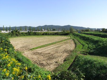| 館中心部付近のようす。右手が現在の斎勝川本流。 中央奥から左にかけての藪が旧斎勝川流路。 |
