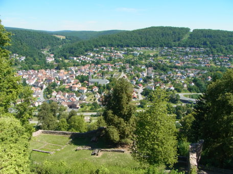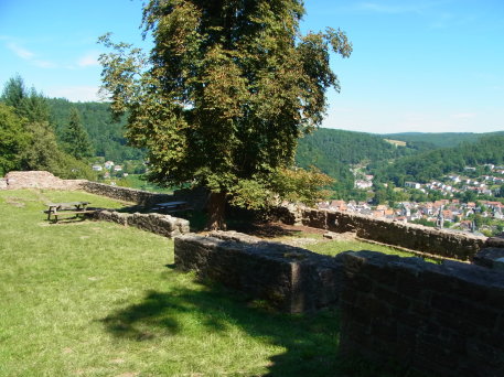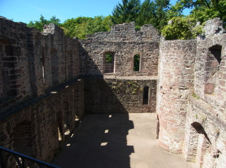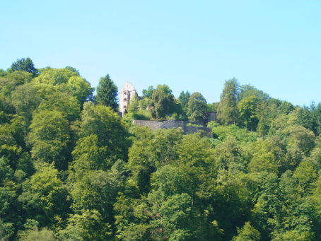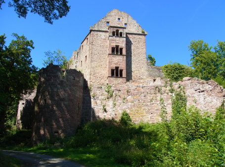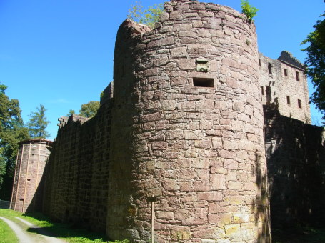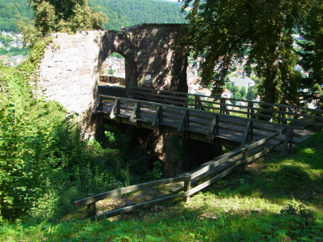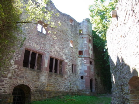 <沿革> ヴィンプフェンに皇帝居城が置かれた、シュタウフェン朝時代の13世紀ごろに築かれたと 考えられているが、詳細は不明である。1339年に、エーベルハルト・リュット・フォン・コレン ベルクが婚姻によってこの城を獲得したとするのが、史料にみられる初出である。1349年 にはプファルツ選帝侯ルプレヒト1世が購入した。その後、城はたびたび抵当に入れられた ため、城主も目まぐるしく替わったといわれる。 1518年、ミンネブルク城と付随する領土はヴィルヘルム・フォン・ハーベルンの世襲領と なった。1522年までに改修が加えられ、今日の体裁が整えられた。普請には、当代随一の 建築家と謳われたハンス・シュタインミュラーが当たった。16世紀末にはハーベルン家は 無嗣断絶し、ミンネブルク城は選帝侯領の貯蔵庫となった。 三十年戦争さなかの1622年、カトリックのティリー伯ヨハン・セルクラエスがバイエルン軍 などを率いて城へ攻め寄せた。当時のミンネブルク城は部分的に綻んでおり、城壁の隙間 を見つけて乗り込んできたティリー伯軍によって攻め落とされた。戦後は再び選帝侯領の 大蔵となった。 1803年にバーデン大公カール・フリードリヒがバーデン選帝侯となり、プファルツ選帝侯領 がバーデン領に組み込まれると、ミンネブルク城は打ち捨てられ、廃墟となった。19世紀末 ごろから保存運動が盛り上がり、史跡公園として整備されて今日に至っている。 <手記> ミンネブルク城は、ネッカー川とベッヒェルスグラーベン川の合流点にせり出した山上の城 です。麓の川沿いにはキャンプ場があり、対岸のネッカーゲラッハはのどかな保養の村と いった感じの町で、城跡も薫風さわやかな史跡公園となっています。 入城口は(おそらく)1か所しかなく、堀切にかかる木橋を渡り、門跡の遺構をくぐって城内 に至ります。主城域は大きく分けて上段の主郭と下段の副郭の2つから成っています。現在 残る建物は、ほぼすべてが主郭に集中しています。この主郭の御殿建築についても、天井 まで残っているのはごく一部で、あとは壁のみの廃墟です。天井が残っている建物だけは 上まで登ることができ、景色を楽しめます。 副郭にもかつては建物が巡っていたものと思われますが、今は基部のみが露わとなって います。ここにはテーブルやイスが置かれていて、逆に城内で一番開放的でくつろげる空間 となっているようです。 全体的に、観光スポットというよりは地元っ子やキャンプなどの保養客の憩いの場となって いるようで、お城の草に寝ころびて愛を育むカップルを3組ほど見かけました。おかげさまで、 私の方がふさわしくない客のような気がしてしまいました(笑)。 |