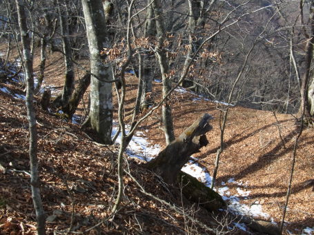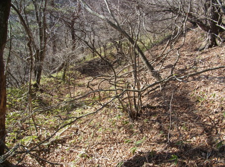 | 堀切に続く竪堀と横に派生する横堀を望む。 | |