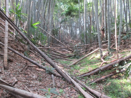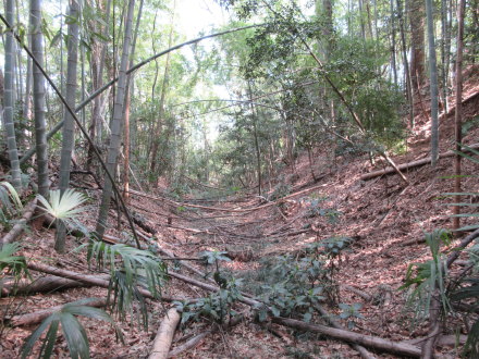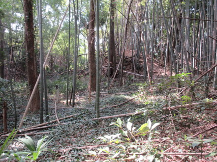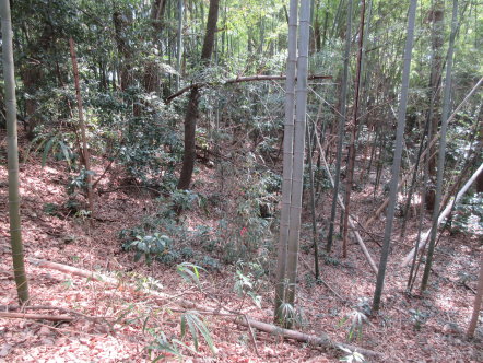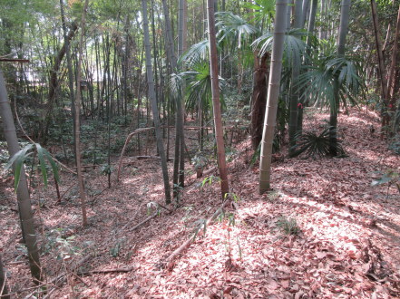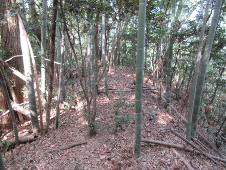 <沿革> 『新編武蔵国風土記稿』では、城主として足立右馬允遠元と石井丹後守の名を挙げ、 「いづれも定かならず」としている。現地説明板では14世紀の築城としているが、論拠は 不明である。 遠元は武蔵国足立郡に拠った平安末期の武士で、源頼朝の挙兵に従い、十三人の 合議制に加わる有力御家人となった。遠元の館跡とされる場所は、桶川市内だけでも 三ツ木城のほかにも2か所ある。旧足立郡内に広げるとさらに伝承地は増え、特定は 困難といえる。ただし、遠元の一子遠村が三ツ木城の東に延びる川田谷を苗字として いることから、『日本城郭大系』では足立氏ゆかりの館があったものとみなしている。 もう一方の石井丹後守は、戦国時代の岩付太田氏家臣とされる。『埼玉県史』では、 北西の石戸城とともに松山城と岩付城の連絡の役割を負っていたと推測している。 <手記> 三ツ木城にちなむ城山公園が目印で、園内の池の南西の道を歩いていると、城跡 の説明板があります。三ツ木城は北向きの小さな舌状台地を利用した城で、三方を 囲む公園は、もともとは深田か湿地帯だったものと思われます。 説明板の裏手に幅の広いコンクリート溝があり、それをひょいと越えると城山に取り 付けます。斜面を登ると横堀状になった豪壮な空堀が現れます。堀を越えてもうひと 登りすると土塁の上に出て、その内側が主郭となります。先端付近には櫓台のような 高まりもあり、造作量はそれなりに大きいものと拝察されます。少なくとも、足立遠元 の館跡のままではないことは確かです。 三ツ木城の立地とみると、石戸城と同じく北向きの舌状地形にあり、同時期に同じ 目的で整備されたとみるのは妥当でしょう。すなわち扇谷上杉氏と山内両上杉氏が 争った15世紀の長禄の乱に際して、扇谷上杉氏家宰太田氏によって築かれたとする のが最も自然と思われます。 |