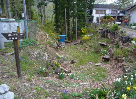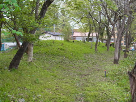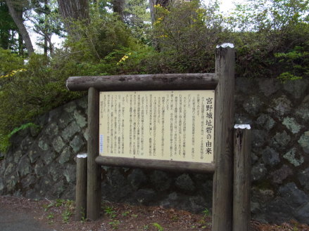 | ホテル駐車場内の説明板。 背後の高まりは土塁。 |