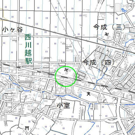 <沿革> 『新編武蔵国風土記稿』には、「水野屋敷跡 法心寺の地続きにして南の方なり 今は陸田となる」とある。同書の法心寺の項には、水野織部忠守の次男多宮守重 が中興の祖であると記されているが、寺伝では守重の没年を天正元年(1573)と していることから、徳川家臣である忠守・守重父子が同十八年(1590)の徳川家康 の関東入国以前に同寺を中興することは難しいとして疑問を呈している。そもそも、 守重は江戸時代に旗本となっているため、少なくとも没年については誤りである。 江戸時代には、小室村は三枝土佐守家の所領であったとされる。同家は、武田 二十四将に数えられる三枝昌貞(守友)の子守吉にはじまる。守吉の子守重(守恵) は徳川家光の小姓となり、慶安四年(1651)の家光が死に際して殉死した。水野 屋敷については、水野守重と三枝守重を取り違えたとも考えられる(両者は同時代 に生きていたが、前者の方が後者より長生きである)。他方で、『記稿』にによれば 多宮守重の法名は小室院月叟法心居士とされる。これが正しければ、多宮と小室 村には関係があったと推定できる。 三枝家は、元禄十一年(1698)に近江国内へ所領替えとなった。小室村の処遇 については詳らかでないが、おそらく幕府直轄領となり、屋敷も遅くともこのときに 廃されたものと推測される。 <手記> 『記稿』に屋敷跡と書かれている法心寺の南側は、現在線路や県道および宅地 となっていて、それらしき痕跡はまったくみられません。法心寺境内も、遺構どころ か案内等もなく、手がかりは皆無です。 そもそも江戸時代初期までは存在したと思われるにもかかわらず、記録が混乱を きわめており、残念な限りです。 |