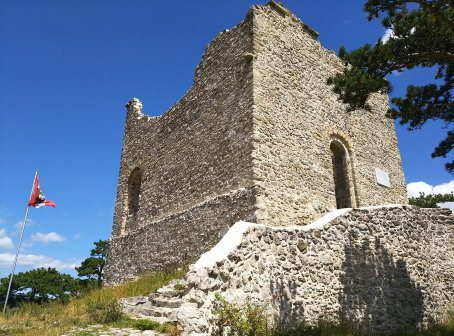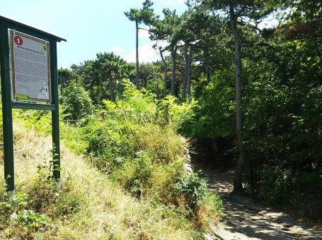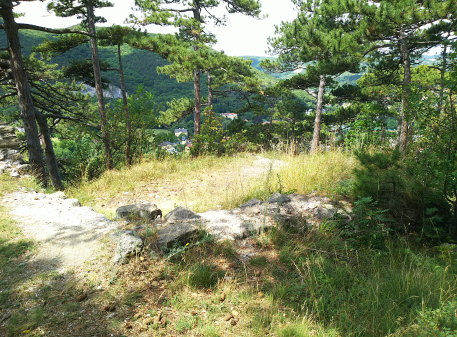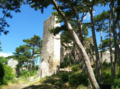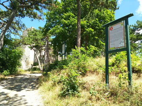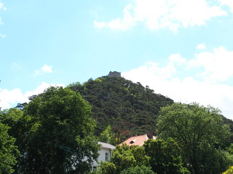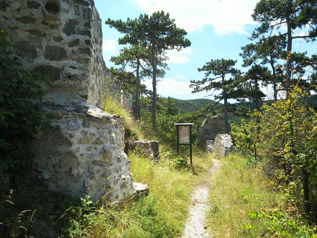 <沿革> 12世紀中ごろに、メルク修道院からメートリンク領を取得したオーストリア辺境伯(1156年 以降は公)バーベンベルク家によって築かれたと考えられているが、正確な築城年は定か でない。バーベンベルク系初代オーストリア公ハインリヒ2世の一子ハインリヒは、2代目と なった兄レオポルト5世によりメートリンクに封じられ、「ド・メードリヒ(de Medlich)」を称した。 1236年にハインリヒの子孫が絶えると、メートリンク領はレオポルト5世の孫のオーストリア 公フリードリヒ2世に召し上げられた。喧嘩公とあだ名されたフリードリヒ2世が1246年に戦死 すると、バーベンベルク家のオーストリア支配も終わりを告げた。その後、バーデン辺境伯 ツェーリンゲン家2代とボヘミア王オタカル2世が相次いでオーストリア公となり、1278年には ハプスブルク家初の神聖ローマ皇帝ルドルフ1世がオタカル2世を討ち取り、オーストリア公 の地位も獲得した。 ハプスブルク家のもとで、メートリンク城の防備は強化されていった。しかし、1400年頃に オーストリア公アルブレヒト4世は城をパッサウ司教への抵当に入れた。以後メートリンク城 は所有者を転々とし、1529年の第一次ウィーン包囲でトルコ軍により破壊された。1543年、 当時の領主であったロドロン伯ジグムントにより、城はルネサンス様式で再建された。だが、 1556年に落雷による火災で建物のほとんどが焼け崩れた。その後は復興されることなく、 廃墟となって今日に至っている。 <手記> メートリンクはウィーン南方郊外の小都市で、城はその旧市街から少し谷筋に入った場所 にあります。日本の開発領主の詰城にはあり得そうな選地ですが、メードリンクの町を押さ えるならリヒテンシュタイン城のある目の前の独立山塊を利用する方がヨーロッパの文脈に 合っているような気がします。この点は個人的に今なおちょっとした謎です。 バス停から城山西麓の谷筋を遡ると、尾根筋背後の堀切下に回り込めます。城跡内には 2013年に設置された説明板が要所要所に立っていて、とても見学しやすくなっています。 ただし、外国人が来ることは想定していないのでしょう、ドイツ語のみです。ヨーロッパでは 珍しく城内を曲輪ごとに分けて解説していて、正規ルートでは付け根の堀切脇が大手口で、 螺旋状に1周ぐるっと回って主塔にたどり着くようになっています。ドイツで共通という訳では ないと思いますが、日本とは逆に一番外側を一の曲輪や一の門と呼び、進んでいくにつれ 2つ目・3つ目となります。 主塔は船形をしていて、峰先側が六角形を半分にした三面テラスのようになっています。 天井はなく、上がることもできませんが、ルネサンス様式の名残と思われる三面テラスの 窓からは一応なかなかの眺望が楽しめます。 とにもかくにも充実した説明版があることによって、メートリンク城は中世ドイツの城を知る にはとても勉強になる模範的な城跡となっています。ウィーンからメートリンクまでは鉄道で 10分程度なので、ウィーンを訪れる城好きの方にはぜひ足を延ばしてもらいたいおすすめの 古城址です。 |