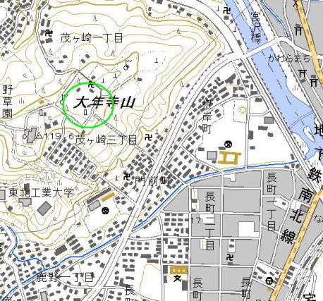 <沿革> 名取郡に勢力を伸ばした粟野氏の初期の居城である。粟野大膳亮宗国が居城を北目城に 移した後も、詰の城として一定の機能を果たしたものと思われる。 江戸時代に入り、仙台藩4代藩主伊達綱村により城跡に大年寺が建立され、仙台城の南の 守りとして重要視された。 <手記> 城跡は、広瀬川河岸に突き出した舌状の山上に位置し、仙台平野を一望できる眺望の地です。 仙台藩以前の奥州街道は、この大年寺山の山裾を廻って広瀬川沿いに北へ抜けて愛宕神社の 麓へ至っていたようで、交通の面からも重要な位置にあったといえます。 現在大年寺があるあたりに城主粟野氏の屋敷があり、階段の続く寺の参道は旧登城路とされて いますが、確証は得られていません。 また、山頂に城跡を示す標柱が建てられていますが、果たしてここが主郭かどうかも判然としま せん。印象として、大年寺山は山頂部の平坦地が非常に広く、もしこの広い山頂域全てを城域とし た場合、かなり規模の大きな城となってしまい、城の年代を考慮すれば非現実的であるように思い ます。おそらくは、山頂に物見など必要な施設を建て、山の付け根を堀切で区切った程度の城だっ たのではないかと、個人的には考えています。 |