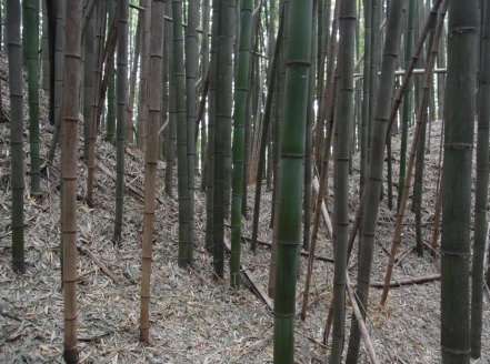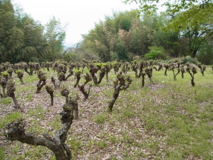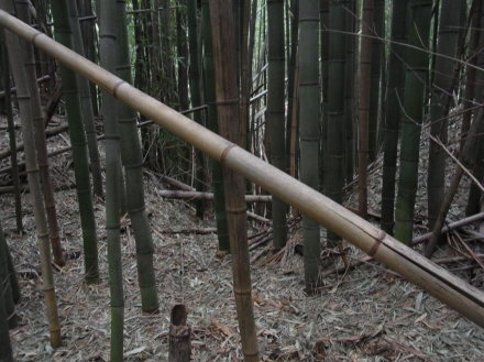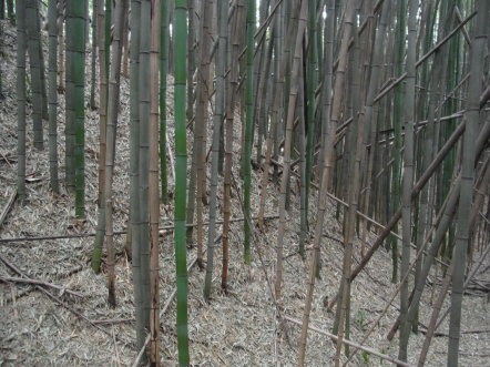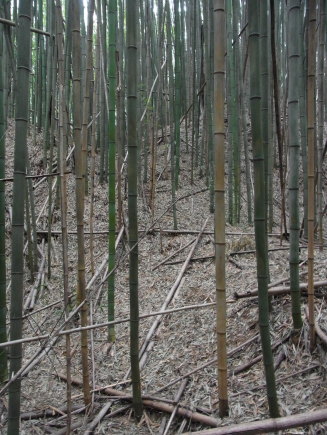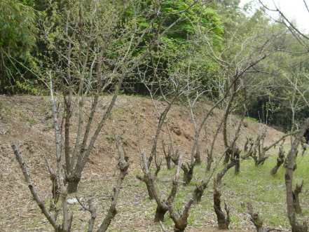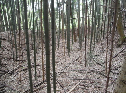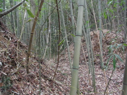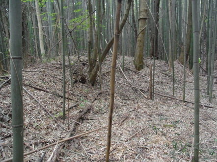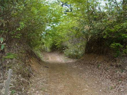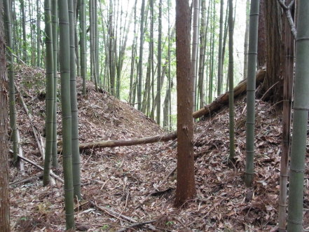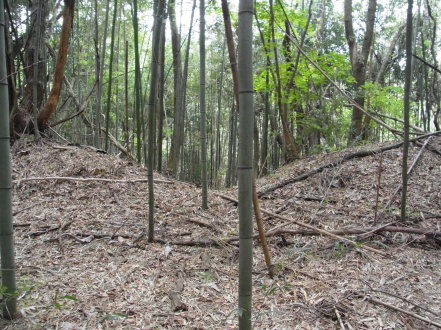 | 峰の付け根側から本丸方面を望む。 二重の土塁を切り拓いて作業道が通されています。 |