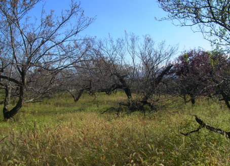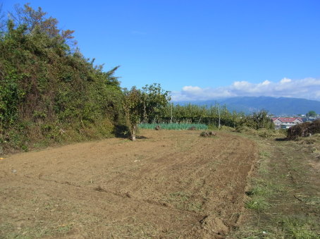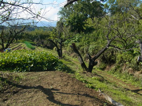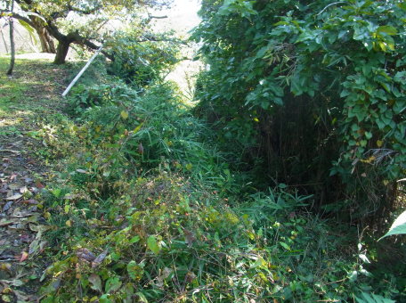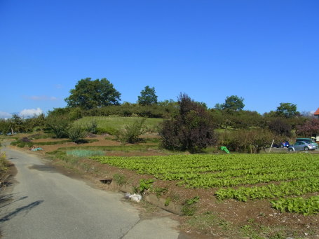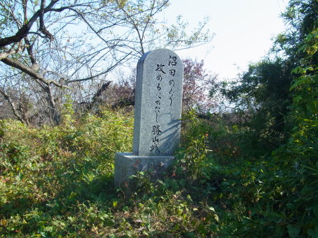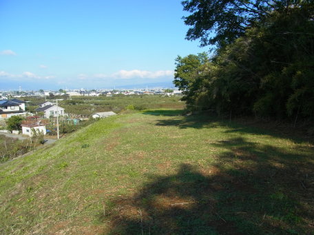 <沿革> 明応年間(1492〜1501)に、武田宗家を継いだ武田信縄と、信縄の父信昌および信縄 の弟油川信恵の間で甲斐国内を二分する内乱が発生したが、明応の大地震を機に一度 和睦をみていた。しかし、永正二年(1505)に信昌が死去すると、信縄・信恵兄弟の間で 再び抗争状態となった。勝山城は、この2度目の抗争時に、信恵の拠点の1つとして登場 する。ただし、勝山城がこのときに新築されたのか、すでにあった城に拠ったのかは定か でない。 勝山城は、甲斐と駿河を結ぶ中道往還のすぐ脇にあり、今川氏や北条氏の支援を受け ていた信恵方にとって欠くことのできない要衝であった。永正四年(1507)に信縄も死亡 すると、宗家の家督は信縄の嫡男信直(後の信虎)が継いだ。信恵は、反信直の国人衆 を糾合し、勝山の東の坊が峰周辺で信直と合戦に及んだが敗れ、信恵はじめ信恵の3人 の子、信恵の弟岩手縄美、武田氏の有力支族である栗原昌種など、主だった武将の多く が討ち死にした。この1戦で、信直は武田家の内紛にピリオドを打った。このとき勝山城 で攻防戦があったかは不明である。 永正十二年(1515)、武田氏庶流の有力国人大井信達が信虎に反旗を翻すと、大井氏 を支援する今川氏親が2千の兵を送り、勝山城に駐屯させた(『宇津山記』)。翌十三年 (1516)九月には、今川軍は再び甲斐へ侵入して万力(山梨市)で武田勢と戦った(万力 合戦)。このときは、おそらく吉田城を拠点としたものと思われる。今川氏の甲斐への介入 は同十四年(1517)に信虎と信達の間で和議が成立するまで断続的に続けられたようだ が、勝山城がこの間ずっと今川氏の支配下にあったのかは定かでない。 『高白斎記』によれば、大永元年(1521)に福島氏(福島正成といわれるが確証はない) が侵攻した際にも、勝山城が拠点として使われたとみられており、「十一月十日敵駿河衆 勝山ヘ移ル」とある。この戦いのさなかに要害城で誕生したとされるのが、後の武田信玄 である。 天正十年(1582)の天正壬午の乱に際し、中道往還から甲斐へ侵入した徳川家康勢に よって、再び拠点として取り立てられた。『家忠日記』には「十一月七日勝山取出普請」と あり、『甲斐国志』によれば服部半蔵正成と伊賀組が守備に当たったとされる。ただし、 乱自体は十月に徳川氏と北条氏の間で和議が成立して終結しており、十一月の普請は、 戦闘用というよりも甲信平定に向かう徳川軍の中継基地としてのものであった可能性も 考えられる。 廃城時期については詳らかでないが、家康が甲信州の切り取りを完了してからまもなく のことと推測される。 <手記> 勝山城は、笛吹川に臨む小高い独立丘を利用した城です。現在城跡は、東半分ほどが 農地となっており、もう半分は藪と化しています。かつては山麓をぐるりと堀が巡っていた と考えられています。 城跡へは、南東麓から農地を縫って登ることができます。しばらくは果樹林が続くため、 城内なのかどうなのかよく分からない感じですが、山腹の中ほどで虎口状の道の折れが あり、ようやく城跡らしさを感じることができます。この虎口の先には勝山城を詠みこんだ 俳句を記した石碑があり、これが城跡を示す唯一のものとなります。旧中道町では俳句 を奨励していたのか、同様の石碑を至る所で目にします。ちなみに、その俳句では「攻め るにかたし」と詠まれていますが、勝山城は独立丘とはいえあまりに緩やかで、お世辞 にも堅い城とは呼べないように思います。 虎口から見て石碑と反対側にある畑地は、もっともそれと分かりやすい曲輪の1つです。 とくに、曲輪の山側にはもっとも明確な堀跡があります。この堀のさらに山側にももう1つ 藪に埋もれた堀がカーブを描いて残っており、二重堀となっていたことが分かります。 石碑のあるところもやや張出した曲輪となっており、その下にはこちらもわりとはっきり した帯曲輪が見受けられます。虎口から奥に進むとまもなく山頂となり、ここが主郭だと 思うのですが、周囲が高い藪に覆われていることもあり、城内でもっとも不明瞭なところ となっています。北側の藪の切れ目からは、前方にさえぎるものがないので甲府盆地を 一望でき、この点が勝山城にもっとも期待されたところだったものと推測させます。 |