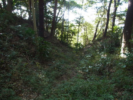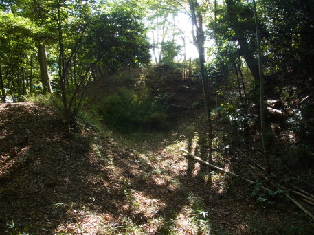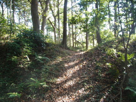 <沿革> 史料にはみられない城である。『東葛郡誌』では、鎌倉時代の相馬御厨地頭相馬胤村の 三男胤光が「根戸三郎」を称しているとして、根戸氏の居城ではないかとしている。ただし、 胤光の名は福島県相馬市の歓喜寺所蔵の『相馬家系図』にみられるものの、その実在は 一次史料からは確認されていない。『郡誌』によれば、城の北西の字御蔵下の西に「殿様 の井」と呼ばれる場所があり、城の糧米を貯蔵したところとする伝承があるとされる。 『富勢村誌』では、城山の南西に「道灌」の小字があり、太田道灌が築いたとする伝承が 地元に残っているとしている。根戸南西の酒井根(柏市)では、文明十年(1479)に道灌と 千葉孝胤の間で境根原の戦いが起きている。この戦いに根戸城が関わっていたかは不明 であるが、我孫子の土豪とされる野嶋入道が千葉氏側で参戦して討ち死にしていることや、 敗れたはずの孝胤が下総の諸勢力の支持を受けて結局千葉氏宗家を継いでいることなど から、道灌が根戸城を築いて維持することができたとは考えにくい。 現在に残る遺構の状況や発掘調査による出土品からみて16世紀までは使用されていた と推定されているが、道灌以降の時代については伝承もみられない。 <手記> 根戸城は、手賀沼北西隅付近に臨む台地の先端に位置しています。城跡のある台地の ほぼ中心に、現在我孫子市と柏市の市境がありますが、柏市側が境界線に沿ってびっしり 住宅地となっているのに対し、我孫子側はほとんど旧来のまま手つかずとなっているため、 幸運にもほぼ全容が残っています。 城跡へは、北西隅付近の住宅地角から行くことができます。南麓から登る道もありますが、 こちらは下草がやや伸びていて入口が分かり難いです。ただ、唯一の説明板は城跡先端 の櫓台(後述)下の半隧道脇にしかありません。この隧道は、櫓台を残して無理やり削った 感じが全開で、ありがたいような涙ぐましいような気持ちになります。 『日本城郭大系』によれば、根戸城は4つの曲輪から成るとなっていますが、現地で確認 できるのは大きく分けて2郭です。主郭の先に「櫓台」と呼ばれる削り残しのような箇所と、 主郭の南に腰曲輪があるので、『大系』の記述はそれらも加えたものとも思われます。 主郭は四方を深い空堀と土塁に囲繞された台形の曲輪です。内部は私有地らしく、私が 訪れたときには地元と思われる数人の方々が何か作業を行っており、会う方会う方に主郭 には入らないようにと念を押されました。周囲の堀底は、巡って歩いても問題ないそうです。 主郭の西側には副郭があり、その外側にも見応えのある堀が残っています。副郭の西に、 少し離れて円墳(金塚古墳)があるのですが、物見台や番所など何らかの形で城内に取り 込まれていても不思議ではないところ、周辺を見渡しても城の造作らしきものは見受けられ ませんでした。 現地説明板によれば、主城域の北の斜面には「根小屋の坂」と呼ばれるところがあるそう です。現在は道路や線路の建設のせいか地形がいくらか変わっているように見えるうえに、 藪に覆われていて近づくことは困難です。説明板の地形図をみる限り、根小屋の坂は人が 通る道というよりは、斜面を幅広くなだらかに削ったもののようです。とはいえ、斜面の中途 に根小屋集落が建設されていたというようにも見えず、用途は不明です。 城跡全体を俯瞰すると、峰先にありながらさらに周囲に堀を穿って曲輪としているあたり、 上杉氏の城館によくみられる特徴のように思われます。したがって、道灌築城説は疑わしい ものの、そのあたりの時代に完成され、後北条氏の進出ぐらいまで使用されていたのでは ないかな、と直感的に思いました。 線路を挟んだ北側には、法花坊館と呼ばれる城館跡が発見されており、周辺には「台田」 「中馬場」「上屋敷」「御蔵屋敷」「北ノ内」といった城館関連とみられる小字が残っていたと されています。北柏駅を挟んだ北西には、構造的に同時代のものと思われる松ヶ崎城址も あります。根戸城から松ヶ崎城にかけての地域は手賀沼の最奥にあたり、当時は城の直下 まで水が迫っていたものと思われます。根戸城の東側には船戸の地名が残ることからも、 根戸城から松ヶ崎城へかけての広い範囲にわたり、西からの陸運と東への水運の交わる 結節点として賑っていたのではないかと推測されます。 |