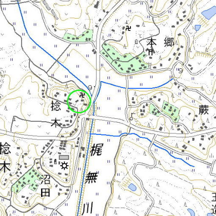 <沿革> 天正年間(1573〜92)に捻木新左衛門が築いたと伝わる。北東向かいに芹沢城があるため、 捻木氏は芹沢氏の家臣ないし一族と推測されるが、詳細は不明である。 <手記> 捻木館は、梶無川が緩やかにカーブする内側の丘陵際に位置しています。北と東が河岸の急崖 となっており、西と南に堀を穿っていたものと推測されます。 現在、城跡は西光寺境内となっています。周辺も畑地・宅地化が進み、遺構の確認は困難です。 寺の南側の門前に、西麓から登ってくる道があるのですが、あるいは往時の堀を利用した堀底道 かもしれません。ただ、現状からは館の全容や遺構の状況を推察するのは難しいと思われます。 |