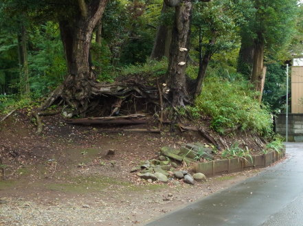 <沿革> 茨城県の遺跡地図(いばらきデジタルまっぷ)に記載があるが、詳細は明らかでない。 野々井城跡に建つ白山神社は、縁起によれば地区の祖である長束民部・兵部・刑部の 三兄弟が、養老二年(718)に創建したものとされる。ここで、同じ取手市内の取手城に ついて、『日本城郭大系』では戦国時代の「長策民部」の居城とある。『大系』の典拠は 不明であるが、「長策」を「長束」の誤記ないし転訛とすれば、野々井城についても長束 氏が築いた城館とみることも可能と思われる。 <手記> 野々井地区の白山神社境内が野々井城址とされています。境内の四周には明確に 土塁跡が認められますが、必ずしも城館のものと言い切れるものでもありません。これ を城跡のものとすれば、野々井城は台地の角に築かれた長方形の城館といえます。 北辺下の道路は堀跡のようにも見え、また北東隅には櫓台状の高まりと虎口状地形 がみられます。 西側は谷戸になっており、かつてはおそらく藺沼(いぬま)から続く湿地が入り込んで いたものと思われます。稲作に向いた土地のようには見受けられず、集落の広がって いる台地上に畑を拓いていたものと考えられ、かなり古い時期の開発領主の館とみる のが適当かと思われます。 長束(長策)氏についての考察は私の直感によるものですが、8世紀初頭に開発が 始まったというのはさすがに早すぎるような気がするので、武士の時代に入ってから、 野々井や取手に長束氏が入植したとする推測は、充分あり得るものと考えています。 |