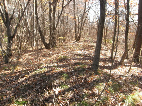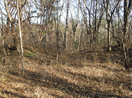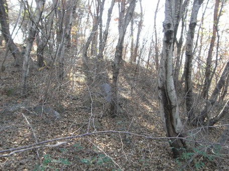 | 山頂南側。土塁跡か。 右手に長靖寺があり、曲輪跡のようにも見えます。 |