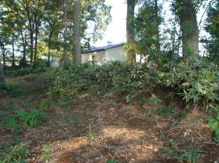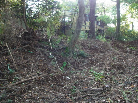 <沿革> 『新編武蔵国風土記稿』に、「陣屋ありしと云 何人の居所なることを云へず 今三四反 許の所、廻りに土手をかまへたる跡のこれり」とある。そのほかに史料や伝承はみられず、 詳細は不明である。 <手記> 団地入口交差点南側の河岸上が大穴山館跡とされています。一部がパターゴルフ場 などになっている雑木林が中心部とみられていますが、説明などはありません。『日本 城郭大系』によると、コの字型に土塁が残るとありますが、崩されてしまったのか今では はっきりとしたものは見られません。ただ、コの字型の土塁うち南北方向のものと、南側 の東西方向のものについては、その痕跡のような段差地形が認められます。 このほか、雑木林の東側にある工場脇の生活道路沿いにも土塁が残っていたとされて いますが、こちらもやはり失われたのか見当たりませんでした。 すぐ北には大堀山館を中心とする陣城群がありますが、これらと関連があるのかどうか 定かではありません。 |
