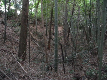 | 溜池東側の土塁状地形。 三の郭の遺構か。 |