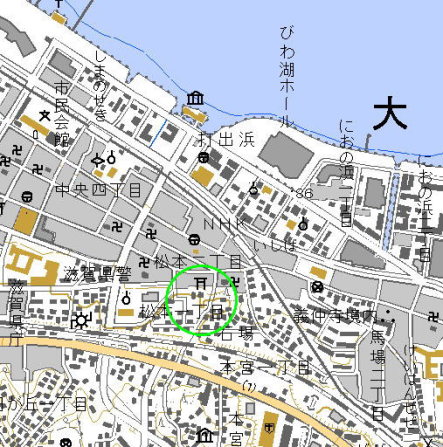 <沿革> 松本民部少輔の城と伝わる。民部少輔について、『近江輿地志略』には「三井寺の僧と戦ひて 死す」とする土地の伝承を載せている。一方、『武芸少伝』『射家系譜』では、民部を佐々木氏の 一族で吉田上野介道宝の季子としたうえで、越前にて戦死したとしている。『志略』では前者の 伝承を「誤り伝うべし」として疑問視しているが、民部少輔について詳細は不明である。 <手記> 平野神社の東麓門前に、古くは字城ノ内と呼ばれる畑地があったとされています。周辺は、 南から伸びる舌状の丘に挟まれた谷戸となっていて、領主の館に適した地形となっています。 また、神社の南東、市民病院の北、国道やJRの線路となっているあたりの丘の上を、字古城と いったそうです。おそらく、谷戸の居館と山上の砦から成る城館だったものと推測されます。 『中世城館調査報告書集成』では平野神社の鎮座する丘も城域と捉えていて、周辺に「腰郭 の面影」がみられるとしています。丘の頂上はじめ全体が宅地化・社地化されていて、藪の中に 削平地様のものが見られはするのですが、遺構かどうか判然としません。ただ、ここに防御施設 が何もなかったとも考えにくいと思われます。 |