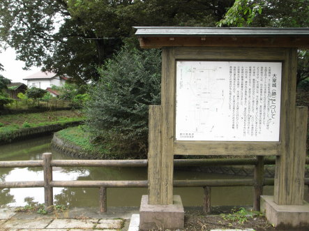 | 二の丸南東隅の説明板。 背後に水濠と土塁。 |