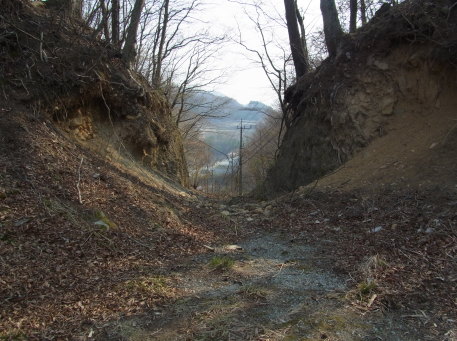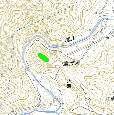 <沿革> 大渡の烽火台について、史料上の記述や伝承の類はみられない。『日本城郭大系』に よれば、大渡から小森川を遡った岩下集落に、小森将監なる人物の落ち武者伝説が残る とされる。ただし、『大系』でもこの人物と大渡の烽火台を即座に関連付けることは避けて いる。 <手記> 大渡の烽火台は、塩川の屈曲部に突き出た半独立山上にあります。三方を川に囲まれ、 唯一の地続きである南東側の鞍部は鳥井峠と呼ばれ、信州往還である穂坂路が通過して います。 史料にも伝承にも現れないため、大渡の烽火台というのは仮称と思われます。だとしても、 何を以てこれを烽火台としたのか、私には疑問です。穂坂路は、ここで鳥井峠を抜けるより ほかに道はなく、峠を眼下に扼すことのできる大渡の烽火台は、要衝中の要衝といえます。 もちろん、逆にいえばこの城を介さなければ、穂坂路の南北の情報伝達は困難ということに なりますが、それ以上に街道を直接把握できるという点の方が、大きな意味をもつと思われ ます。 その証拠というわけではありませんが、大渡の烽火台は、他の甲斐の一般的な烽火台と 呼ばれる遺構と比べて、多くの曲輪を有しています。頂上の主郭から、峠に向かって東側に、 確実なものだけで3つほどの腰曲輪が連なっています。その下にも、小規模な平場が延々と 続いており、全部が全部とは思えませんが、いくつかはやはり削平地であると思われます。 主郭は、北辺にのみ土塁を伴っています。郭内には、秋葉神社の小祠と、倒れて朽ち果て てほとんど読めなくなっている標柱の残骸があります。この土塁は、主郭の西端で堀切状に 切れています。この堀切は、あまり用をなさないのではないかというくらい小規模なもので、 その先には細尾根が続いています。尾根の西端まで行ってみましたが、とくに造作はみられ ず、三方は塩川に落ちる急崖となっていました。この城が、鳥井峠側からしか攻められること を想定していなかったことを示しているものと思われます。 以上のことから、大渡の烽火台は烽火台で終わるには規模が大きく、それなりに城として の体裁をもっており、とりわけ北側と峠のある東側に防御の意識を向けていることがうかがえ ます。したがって、この城は佐久側からの侵入に備えた立派な城砦として、おそらく武田氏に よって築かれたものとみるのが妥当なのではないかと推測されます。もちろん、佐久方面から 甲斐への侵攻のおそれがなくなった後も、烽火台に格下げされて使用された可能性は否定 できませんが。 |