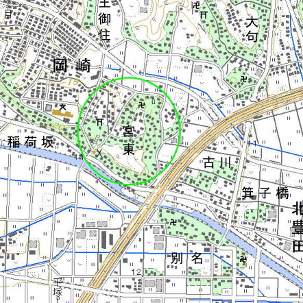 <沿革> 三浦義明の弟四郎義実は、相模国大住郡岡崎を領し岡崎氏を名乗った。岡崎義実の 館について、以前は無量寺一帯の岡崎城が充てられていた。しかし、岡崎神社周辺に 城館の痕跡が見つかると、こちらが岡崎氏の館跡と考えられるようになった。岡崎氏は、 源頼朝の挙兵時から従った幕府創設の功臣であるが、建暦三年(1213)の和田合戦に 巻き込まれて滅んだ。 岡崎神社続きの峰の北東麓にある紫雲寺について、『新編武蔵国風土記稿』矢崎村 の項では開基を大森信濃守氏頼とし、「境内は即同人宅蹟なりと云」とある。紫雲寺の 門前には氏頼館跡の石碑が建てられており、そこには氏頼の「若き頃」の館とあるが、 根拠は不明である。氏頼ははじめ小田原城、後に岩原城を居城とした。氏頼の娘は、 氏頼死後に岡崎城主となった三浦義同の母である。 このほか『日本城郭大系』では、『北条記』にある「急て岡崎辺へ落させ玉ひ 重て軍兵 を催し 城を取り返すべし云々」という一節から、明応四年(1495)に氏頼の子藤頼が北条 早雲(伊勢宗瑞)に小田原城を奪われた際(奪取年には異説有り)、藤頼は真田城では なく岡崎の大森氏旧蹟に逃れた可能性を指摘している。 <手記> 岡崎神社一帯の遺構は史料には登場しないため、『大系』では「岡崎南部方形囲郭群」 と仰々しい名称が付けられたり、『神奈川の城』では村名から単に矢崎城と呼んだりして います。今日では義実時代の館に発するものと考えられているため、ここでは表題を岡崎 (氏)館としました。 城地は北西から細長く続く峰の先端付近にあり、さらに逆Π字型に尾根の先が割れて います。Πの又の間を山王谷戸といい、岡崎氏の居館はここに営まれていたものと推測 されています。また、山王谷戸を囲う峰の西・南・東の三方に、方形の曲輪が設けられて いたと考えられています。岡崎神社近辺は西郭とされ、その西側に隣接してもう1つ小郭 があったとみられています。神社正面左手にはこんもりした茂みがあり、これが両曲輪を 分ける土塁とされています。 南郭(『大系』では南東郭)は、現在個人の旧宅となっています。なので内部のようすは 分かりませんが、北辺に土塁と思しき土盛りがあります。道路に面した部分はコンクリート で舗装されていますが、岡崎館でもっとも城跡らしい様相を呈しています。ただ『大系』に よれば、北辺に残っていた土塁は関東大震災で崩れたとされ、現在のものが遺構と関連 があるのかについては不明です。 東郭一帯は完全に宅地化されていて、『大系』にあるような方形区画は失われています。 堀切跡とされている箇所が、住宅地の狭間の切通道となっていて、あるいは遺構を利用 したものとも考えられます。東郭の尾根先に紫雲寺があり、その門前に大森氏頼館跡の 石碑があります。 山王谷戸は典型的な鎌倉期の館地形であり、ここに岡崎氏の館があっただろうという 推測は、妥当と思われます。背後の峰に曲輪群が設けられたのがいつごろかは分かり ませんが、大森氏時代までは下らないでしょう。 氏頼館跡碑のほかに現地に城館跡を示すものはありませんが、岡崎城址の無量寺の 説明板では、前期の岡崎城として岡崎館に触れられています。 |