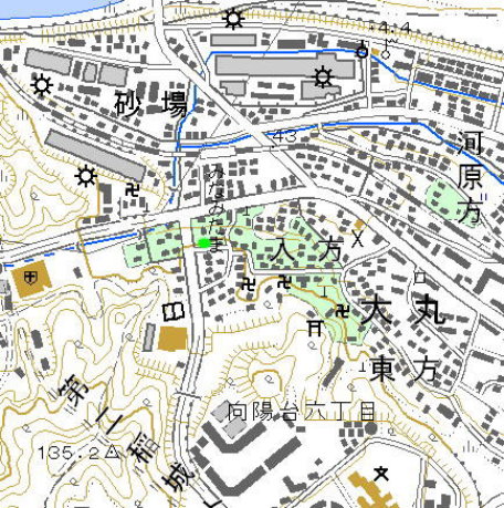 <沿革> 『新編武蔵国風土記稿』に、「塁跡、字西田にあり、土人これを城山と呼ぶ(中略)何人の居住せし と云こと伝へず」とある。 多摩ニュータウン計画に伴い昭和五十五〜六十一年(1980〜86)にかけて発掘調査が行われ、 大丸城は14〜16世紀ごろに使われていたことが明らかとなった。 <手記> 大丸城は、多摩川に臨む半独立丘にあったとされていますが、現在はニュータウン造成により山 ごと消滅しています。北に是政の渡しがあり、これを監督する目的で築かれたものと推測されます。 南多摩駅から向陽台へ向かう道から住宅街へ少し入ったところ(地図の緑点のあたり)に説明板 が設置されています。説明板のあるところが城跡の北西麓にあたるということで、そこから南東に 目をやると、城山は面影もなく住宅地となってしまっています。 近所に城山公園というのがありますが、こちらは城跡とは無関係なので注意が必要です。 |