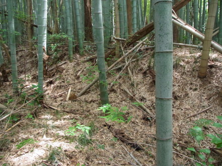 <沿革> 「堀の内」の小字が残り、遺構が認められるとされるが、詳細は不明である。 <手記> 『余湖くんのホームページ』さまの情報によると、小坂城南東の慈眼院背後の丘が 比定地とされています。『大和之古城』さま管理人のダイさんたち3人と訪ね、慈眼院 の西側を登る切通し道から竹藪に突入したところ、堀や土塁の遺構を確認しました。 竹藪があまりに深く、残念ながら全体像を把握するには至りませんでした。ただし、 現在の切通しは後世につくられたものと思われるので、おそらく当時は崖端の方形館 だったのではないかと推測されます。 小坂城との間には距離的な断絶があり、両者に相互補完の関係があったとは考え にくいでしょう。構造的には明らかにこちらの方が古いものなので、あるいは小坂城が 築かれる前の小坂地域の領主の居館とも拝察されます。 天文十七年(1548)には小田氏治と東条重定の間で「小坂の戦い」があり、一般的 には小坂城をめぐる攻防戦であったと解釈されています。ただし、その舞台はこちらの 方であった可能性も、考えられようかと思われます。 |