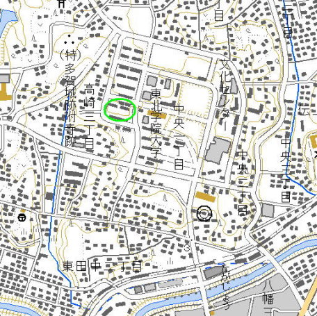 <沿革> 多賀城市埋蔵文化財センターでは御屋敷遺跡とされている。『日本城郭大系』では 留守氏家臣留ヶ谷内膳の居館ではないかと推測しているが、詳細は不明である。 <手記> 御屋敷館は、東北学院大学工学部の西側、陸上自衛隊高崎宿舎の南端の区画に あったとされています。桜井館や志引館とは峰続きの丘陵頂部にあり、周辺の諸館 のなかでは最高所に位置しています。下の写真の通り立派な団地になっているので、 当然遺構は残っていません。 ちなみに、この宿舎に住んで苦竹の仙台駐屯地に勤めてらっしゃる自衛官の方は、 城跡に住んで(御屋敷館)城跡に勤める(南目館)という中世城郭ファンにはなかなか コアで羨ましいことになります。 |
