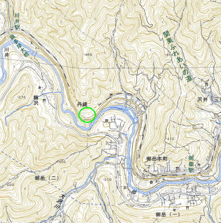 <沿革> 『新編武蔵国風土記稿』の川井村の項に、「柵跡」として平将門の従者尾崎十郎なる人物が柵を 構えて警護したとする伝承が載せられている。ただし、尾崎十郎については同書においても実在を 疑われている。 <手記> 尾崎柵があったとされる字尾崎は、川井駅と御嶽駅の中間あたり、多摩川の屈曲部に峰がせり 出した先端の緩やかな傾斜部にあたります。現在、麓を国道が走っているため、地形はいささか 改変されているようです。 国道の上の丹縄には、集落内を貫通する生活道路があり、おそらく旧青梅街道の名残と思われ ます。ここに城館が設けられていたとすれば、集落とこの街道を扼するのが役割でしょうから、集落 背後の八雲神社裏手の峰が怪しいように感じます。ちょうど、間伐されたばかりのようで見通しも よかったので、脇から峰をよじ登ってみました。神社の真裏は、峰の小さなせり出し部になっており、 登ってみると、狭いものの見張りの人員を数人置くくらいのスペースはありました。そして、西側脇 に目をやると、人工の削平地にみえる箇所がありました。すぐさま腰郭遺構だと狂喜乱舞するわけ にはいきませんが、ここが城跡の一部である可能性は、充分にあると思われます。 築城主については、平将門云々というのはとても信じがたいところで、もし尾崎十郎が実在したと しても、三田氏か後北条氏の家人と考えるのが妥当と思われます。 |