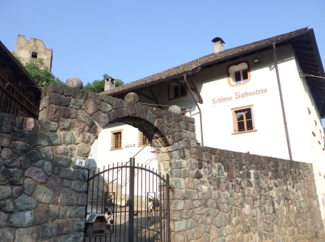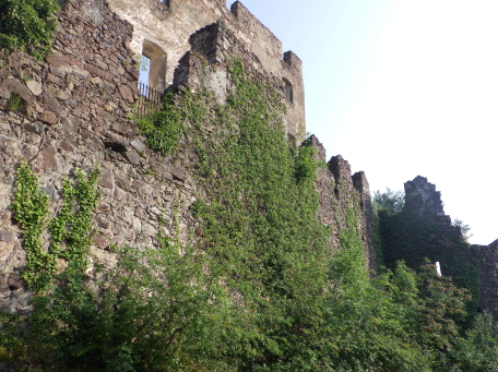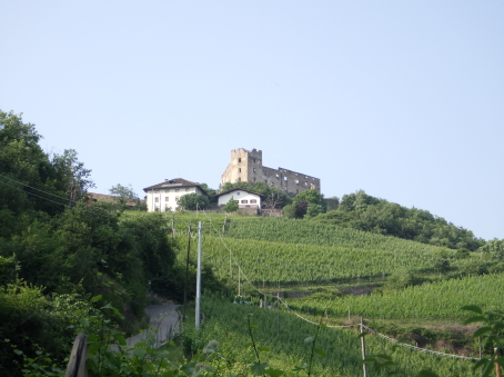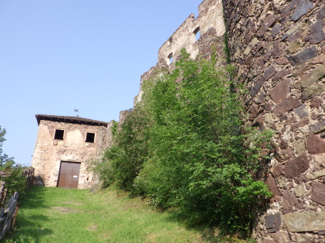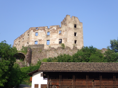 <沿革> 1207~17年ごろに、トレント司教領主の命で築かれたとみられている。城主としてアルベルト・ フォン・ラーフェンシュタインの名が見え、ラーフェンシュタイン家やボーツェン家が城代を務めたと される。1255年には、フリードリヒとベーラル・フォン・ヴァンゲンの兄弟が城主権を委ねられた。 2人はもともとタルヴェーラ川を遡ったヴァンゲン=ベッレルモント城の城主であったが、1237年に ルンケルシュタイン城(ロンコロ城)を築いて移っていた。 1277年、城はチロル伯マインハルト2世に攻め落とされ、破壊された。マインハルト2世の孫娘 マルガレーテ・フォン・チロルが、1342年に2人目の夫ブランデンブルク辺境伯ルートヴィヒ2世と 結婚すると、ルートヴィヒ2世はラーフェンシュタイン城を後期ロマネスク様式で再建した。1363年 にチロル伯の地位と領土がハプスブルク家へ移譲されると、1365年には城代のフランツ・フォン・ アウエルがヴォン・ラーフェンシュタインへと改姓している。その後15世紀にかけて、環状城壁や 城塔などがゴシック様式で増築された。 1600年ごろにはトロスト城主ヴォルケンシュタイン家の所有となっていたとみられ、チロル地方 で初めての年代記とされるマックス・ジティッヒ・ヴォン・ヴォルケンシュタインの著した風土記に、 ラーフェンシュタイン城についての記述がみられる。同家によって城はルネッサンス様式に改築 され、ナイルワニの骨などが見つかっていることから、海外の珍品の収集部屋なども設けられて いたと考えられている。 18世紀末ごろにはヴォルケンシュタイン家が城を放棄し、1797年のナポレオン戦争では砲撃を 受けて荒廃した。1897年にはトッゲンブルク伯家によって修築が施され、1931年からはウンター コフラー=シュロッサー家の所有となった。2009~14年にかけて再び大規模に修繕され、現在は ロンコロ城やメレッチョ城と同じくボーツェン城館財団によって管理されている。 <手記> ラーフェンシュタイン城はボルツァーノ(ボーツェン)市街北方の、比高約350mの山上にあります。 なんでこんな高い山の上にと思いますが、当時はさらに上のイェーネジーンという集落まで街道 が通っていたそうです。今ではイェーネジーンはリゾートエリアとなっているようで、車であれば そこへ上がる幹線道路から逸れて簡単に城までアクセスできます。 徒歩の場合はタルヴェーラ川沿いの国道から山道に入ります。その角には、イェーネジーンまで ロープウェイが走っていたようで、発着場の跡が残り目印となっています。城跡までは一本道なの ですが、ここからが大変!車でも一度止まってしまうと危険そうな急坂が延々と続き、最大勾配 はなんと33%だそうです^^; 息も絶え絶えに城の麓まで辿り着くと、城内へは手前のブドウ農家の敷地を通り抜けなければ ならないようでした。運良く家人の方が作業をされていたので、ご挨拶をして許可をもらえました。 イタリア国内とはいえ南チロルも市街を外れると、公用語はやおらドイツ語になります。家人の方 との会話や城内の説明もドイツ語優先で、そもそもロンコロ城などと異なりラーフェンシュタイン城 についてはイタリア語読みへの翻訳すら諦められているようでした。 城内は団体の事前予約などでないと公開されないそうで、個人では環状城壁の外から眺める 程度しかできません。麓の農家ではその名も「ラーフェンシュタイン城(Schloss Rafenstein)」と いうレストランを併設していて、こちらも予約制だとは思いますが、おそらく正面にボルツァーノの 街並み、背後に城跡の景色を愉しみつつ料理を味わえるのでしょう。 外観はまったくの廃墟なのですが、不便なので打ち捨てられたのかと思いきや、18世紀までは 現役で、ナポレオン戦争によってこの姿になったというのは意外でした。 |