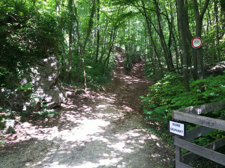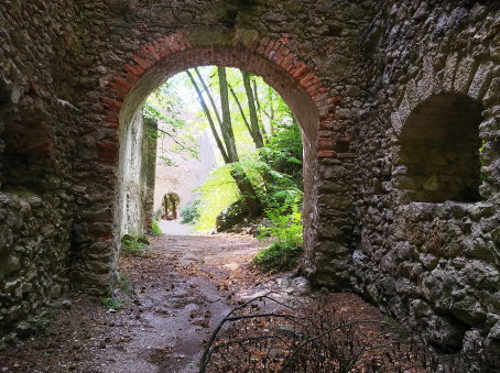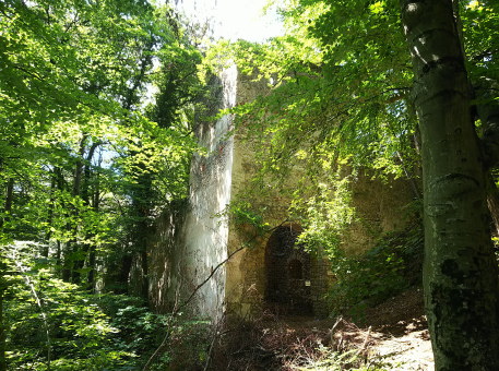<沿革> 向かい合って立つラウエネック城と同じ12世紀ごろに築かれたと考えられているが、詳細な 築城の経緯は不明である。1203年には、オットー・トゥルゼ・フォン・ラウエンシュタインの名が 見られ、この時までにはラウエンシュタイン城も築かれていたものとみられる。オットーの出自 については定かでないが、ラウエネック城主のトゥルゼン家の一族と推測される。 13世紀中ごろには、婚姻によってピリヒスドルフ家の所有になったものと推測されている。 1386年にはハンス3世・フォン・プーフハイムが城を受け継いだが、1408年にはヨハン・ラウン 率いる盗賊団に奪われ、城代クーノ・トラーは殺害された。1466年、ヴィルヘルム2世・フォン・ プーフハイムは、神聖ローマ皇帝フリードリヒ3世に対して反乱を起こした。フリードリヒ3世は 討伐軍を差し向け、ラウエンシュタイン城は包囲された末に開城した。ヴィルヘルム2世は帝国 アハト刑に処され、城はオーストリア大公国の所有財となった。 1477年には、ハンガリー王マーチャーシュ1世麾下の部隊によりラウエネック城とともに破壊 されたが、後にラウエンシュタイン城のみ再建された。マーチャーシュ1世が1490年に死去した ことでウィーンに帰還することができたフリードリヒ3世は、借金の抵当としてラウエンシュタイン 城の所有権を傭兵隊長ハインリヒ・プリューシェンク・フォン・シュテッテンベルクに譲渡した。 1529年の第一次ウィーン包囲で再びラウエンシュタイン城はオスマン軍によって破壊され、 1531年には軍務局長リーエンハルト・キュッテンフェルダーが抵当権者として城を取得した。 1583年、前方オーストリア大公マクシミリアン3世の会計係であったゲオルク・ザウラー・フォン・ ザウアーブルクがラウエンシュタインとラウエネックの両城を購入した。その後も城の所有権は 転々とし、城内は徐々に荒廃していった。 1683年の第二次ウィーン包囲に際して、城は再度オスマン軍に攻撃され、大きく損傷した。 18世紀に入るころには、もはや住むことも困難な廃墟となっていた。 スペイン継承戦争で活躍し、1711年に騎士に取り立てられた当時の城主フランツ・アントン・ フォン・クヴァリエントは、ラウエンシュタイン城の修復を図った。しかし、1720年にクヴァリエント 家は城を売却し、その後ドブルホーフ男爵家の手に渡った。復興工事は、断続的に19世紀末 ごろまで行われ、再び主塔に人が登れるまでになった。 <手記> ラウエンシュタイン城はウィーン郊外の保養地バーデンの西方にあります。シュヴェヒャート川 の開口部に臨む峰の中腹の小ピークに築かれています。川を西へ遡るとウィーンの森を抜けて ザンクト・ペルテルンに通じるため、向かい合うラウエネック城と合わせて、街道筋の城として 重要だったようです。また、西方500mほどのところには、13世紀には廃されていたと考えられて いるシャルフェネック城跡もあります。 バーデン駅から山麓までバスがあるようですが、おそらく本数は少ないでしょう。バーデンには ベートーヴェンの散歩道と呼ばれる散策路があちこちに通じているので、少し時間はかかります が、歩いても来られないことはありません。私は市街中心の観光案内所で自転車を借りました。 先にラウエネック城に登ると、主塔の上から最高のアングルでラウエンシュタイン城の全景を 拝むことができます。城の周囲だけ不自然なくらいに岩が切り立っていて、メルヘン話の古城の ようです。あるいは築城や改修に際して、岩肌も人為的に険しく削られたのかもしれません。 ラウエネック城から見下ろす位置にあることからも分かるとおり、比高はたいしてありません。 登山口から5分ほども登れば城門前に着きます。ですが、倒壊のおそれがあるとかで、門には フェンスが張られそれ以上は中に入れませんでした。外周を巡れるような道もほかになく、仕方 なく外壁を眺めて後にしました。 私が参考にした資料では、上述のとおり19世紀の時点である程度修復されていたそうですが、 その後どのような経緯でまた廃墟になってしまったのかは分からずじまいでした。ちなみに、夜 にはライトアップされるそうです。 |