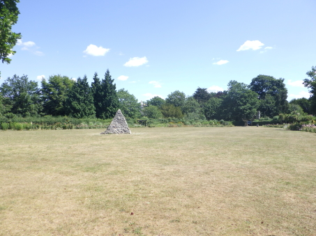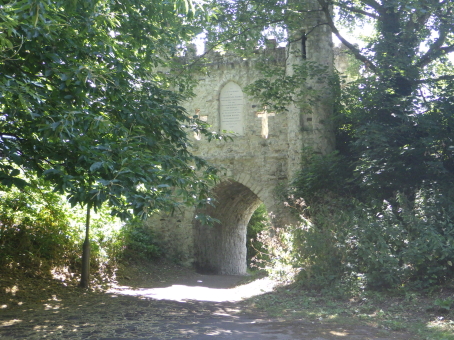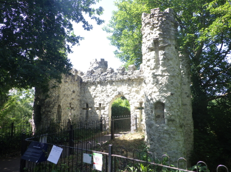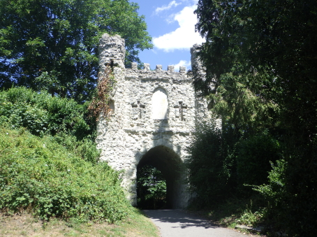 <沿革> ウィリアム1世のノルマン・コンクエストに従軍して功を立て、ルイス城を築いて本拠とした ウィリアムは、死に際の1088年にサリーのライギット周辺を加増され、サリー伯に叙された。 ライギット城はその子2代目サリー伯ウィリアムによって築かれ、1150年ごろには城下町の 建設も命じられた。ライギットの語源には諸説あるが、一説には街の入口に伯家の鹿園が あり、その「牡鹿門(Roe-deer Gate)」が由来とされる。 1215年にマグナ・カルタ(大憲章)の履行を巡り第一次バロン戦争が勃発すると、ジョン王 と対立する諸侯に招かれたフランス王太子ルイ(後のルイ8世)が翌1216年に渡英・侵攻し、 ライギット城を占領した。このことは、サリー伯がジョン王の数少ない忠臣であり続けたことを 物語っている。翻って、マグナ・カルタがライギット城の地下洞窟で起草されたとする伝説が 地元に残るものの、事実とは考えられていない。 7代サリー伯ジョン・ド・ウォーレンが1347年に嗣子なく没すると、伯爵位はジョンの姉の子 であるアランデル伯リチャード・フィッツアランに受け継がれた。1397年、ライギット城は後に ノーフォーク公となるハワード家をはじめとした複数の荘園領主の所有となった。 1550年ごろには、『殉教者たちの物語(Book of Martyrs)』を著したジョン・フォクセが城に 居住した。ジョンは3代ノーフォーク公トマス・ハワードの娘メアリー・フィッツロイをパトロンと して、メアリーの甥で後に4代ノーフォーク公となるトマスの家庭教師を務めていた。 17世紀半ばのイングランド内戦に際して、チャールズ1世を支持するホランド伯ヘンリー・ リッチら王党派がライギット城を駐屯地として取り立てた。1648年に王党派が敗れ、翌年に チャールズ1世やヘンリー・リッチらが処刑されると、ライギット城は破城された。 以後、城が再興されることはなかったが、1777年にリチャード・バーンズなる人物が私財 を投じ、模擬門を建造した。門の両側面には、英語とラテン語でその旨が刻まれている。 <手記> ライギットはロンドンの南の郊外に位置する小都市で、さらに南方10km弱にはガトウィック 空港があります。日本人が習う英語の発音ではレイゲイトと読みそうな感じで、シャーロック・ ホームズシリーズの『The Reigate Squires』は「ライゲートの大地主」と訳されているようです が、地図や現地の人の発音はたしかにライギットに近かったです。 城はライギットの目抜き通りを南麓に望む小丘の上にあり、堀に囲まれた典型的なモット・ アンド・ベイリーであったことが容易にうかがい知れます。城内は公園となっていて、横堀の ほかに遺構らしきものは見当たりません。「男爵の洞窟」と名付けられた上述の地下洞窟が 建造物としては現存している唯一のものだそうで、夏期に月一くらいの頻度で公開ツアーが 催行されているようです。また、主郭の東側にはリチャード・バーンズが建設した模擬門が 堀を跨ぐ橋を兼ねていますが、いたるところに十字を散りばめたメルヘンともホラーともつか ない非現実的な雰囲気を醸し出しています。 |