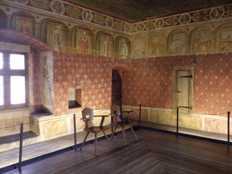 | 西館の「浴場の間」と14世紀のフレスコ画。 裸の人物が描かれていることにちなむ名称で、 実際にお風呂があったわけではないそうです。 |