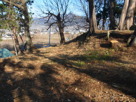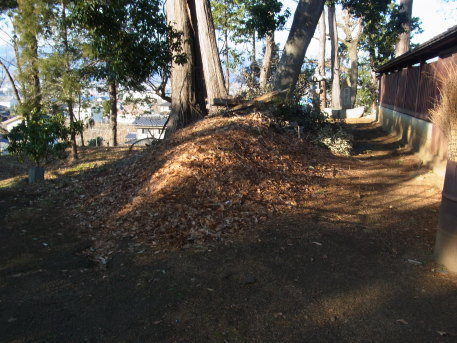<沿革> 三枝氏は、大和朝廷時代に中央から派遣された古代豪族で、三枝守国を初代とする。 三枝氏は野呂を中心に勢力を拡大したが、当館がいつごろ築かれたのかは定かでない。 また、戦国時代に武田二十四将に数えられた三枝守友(昌貞)らと古代三枝氏との関係 についても詳らかでない。守友やその父虎吉は、今の中央市木原に居館を構えていた。 天正十年(1582)に武田家が滅亡した際、野呂の守国神社は織田軍の兵火を受けて 焼失した。館がこのころまで存続していれば、このときに同じく焼亡したものと推測される。 守国神社は、寛文六年(1666)に守友の子孫である旗本三枝守俊によって再興された。 <手記> 南野呂の大宮神社(守国神社)は、その名の通り三枝守国を祀った神社で、その周囲 に「東御所」「西御所」の小字があることから、一帯に城館跡の存在が擬されています。 伝承レヴェルでは、この両「御所」と守国を直接結び付けるものもあるようですが、古代 豪族の居館としては、必ずしもメジャーな立地とはいえないような気がします。 他方で、武田氏重臣として知られる三枝氏は、上記の通りずっと西の木原を本拠地と していたとされ、姓についても山県氏も併用していたとされるなど、古代三枝氏との関連 は、だいぶ不透明であるように思います。戦国時代にここに城館があったとしても、それ はおそらく三枝氏のものではなかったのではないかと、個人的に推測しています。守国 神社は天正十年までにはすでに存在していたわけですから、あるいは境内を利用した 小要塞だったのかもしれません。 大宮神社は、北に田草川を見下ろす河岸の高台にあり、同じ河岸を少し遡ったところ には岩崎館があります。小城館を営むには適地と思われますが、遺構については判然 としません。本殿脇に土盛りと一段下の削平地が見受けられますが、城の遺構なのか 神社の造営によるものかは不明です。 |