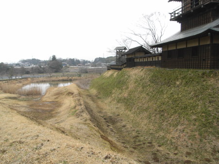 <沿革> 『逆井留系』によれば、小山義政の五男常宗が逆井に入り、逆井氏を称したとされる。 大宝八幡宮の享徳五年(1456)七月銘の銅鐘にも「逆井尾張守沙弥常宗」の名があり、 逆井常宗の存在は確実とみられている。逆井城の原型は常宗によって築かれたと推測 されるが、現在と同じ位置であったかは不明である。 常宗の孫とされる常繁の代の天文五年(1536)、逆井城は北条氏家臣大道寺駿河守 (盛昌と考えられている)に攻められた。城は落ちて常繁は戦死し、逆井氏も滅亡したと される。 天正五年(1577)、勢力圏を大幅に拡大した後北条氏は、玉縄城主北条氏繁に命じ、 逆井城を常陸・下野両国への侵攻拠点として改修させた。以降、逆井城は飯沼城と呼ば れるようになったとされる。翌六年(1578)、氏繁は逆井城で病没し、子の氏舜が城主と なった。その氏舜も、同八年ないし九年(1580〜81)に死去したとされ、跡を弟の氏勝が 継いだ。 天正十八年(1590)の小田原の役で北条氏が滅亡すると、飯沼城も廃城となった。この とき、飯沼城で合戦があったか否かは明らかでない。 <手記> 逆井城は、かつては北に飯沼、西にその入江である蓮沼を望む湖岸の城でした。両沼 とも江戸時代に干拓され、一面の田んぼが広がっています。 現在は、逆井城跡公園として整備されています。この公園は、戦国時代の城郭を本格 復元した数少ないものの1つであるとともに、中世城郭の復元整備のはしりともいえるもの です。昔からぜひとも訪れてみたいと思っていましたが、交通の便のあまりの悪さにこれ まで機会がありませんでした。今回でさえ、城跡に興味のない友人に何とかお願いして、 筑波山から車を走らせてようやく訪城することができました。 一曲輪の櫓門と、二曲輪南西一帯が発掘調査の結果をもとに木造復元されています。 とくに、二曲輪南西は他所ではなかなか味わえない戦国の景観を醸し出しており、これを 見て興奮しない城郭ファンはいないのではないかと思います。なかには、この景観をして 「やりすぎ」と評する人もいるそうです。しかし、発掘調査のみからの復元には当然限度が ある訳で、本当にこの復元が「正確か」どうかは誰にも分かりません。私としては、完成度 というよりきらびやかさとは程遠い戦国城郭を本格復元しようという心意気の方に感じ入り ます。 駐車場を出ると、筋違橋を経て着到櫓に着きます。この櫓は登ることができます。その先 には長い塀を伝って井楼櫓がありますが、こちらは登ることができません。二曲輪にはこの ほかに、移築した関宿城の薬医門と、堀之内大台城の発掘結果をもとに建築された主殿 があります。堀之内大台城の主殿が復元されたのは、同時代の規模の似た城郭だからと いうことだそうですが、一応同城が築かれたのは逆井城の廃城後なので、ちょっと同時代 とはいえないように思います。 二曲輪と一曲輪の間には馬出しがあり、これも発掘をもとに復元したものと思われます。 この馬出しの裏手には、常繁の妻ないし娘とされる智御前が落城の際に先祖伝来の釣鐘 をかぶって入水自殺したと伝わる鐘掘池があります。伝承の真偽はともかく、現在も水を 湛える堀で、城内の重要な水の手であったと推測されます。池の西側からは年代の古い 堀跡が検出され、逆井氏時代の遺構と推測されています。少なくとも常繁の籠った逆井城 が同じ位置にあったことが確認されました。 一曲輪は祠と復元櫓門があるだけで、二曲輪に比べると少々寂しい空間です。この櫓門 は、検出遺構を守るために実際の柱穴から少しずらして建てられています。櫓門と木橋を 渡って再び二曲輪に出ると、逆井城址の石碑があります。ここから旧飯沼沿いに東進する と、虎口を経て三曲輪の復元井楼櫓に出ます。三曲輪と二曲輪の間の空堀には、横矢が いくつかかかっており、後北条氏系の縄張りの息吹を感じることができます。 全体的には、飯沼と蓮沼の天険を背負っているとはいえ、やや単純な縄張りであるように 感じました。これは、逆井城(飯沼城)が後北条氏にとって遠征軍の駐屯基地であったため、 縄張りの複雑さよりも兵の駐屯スペースの確保が重要であったことによるものではないかと 推測されます。 また、逆井城をめぐる問題として、常繁が天文五年(1536)に後北条氏に攻められるという のは、当時の北条氏の勢力圏から考えて不可能ではないか、というものがあります。たしか に、まだ武蔵も掌握していなかった北条氏が逆井に兵を送ることは困難であり、なかんづく 古河公方の勢力圏を通過しなければなりません。この点については、時期が誤って伝わった のではないかとする説があるようです。すなわち、逆井城が大改築される天正五年(1577) からさほど遡らない頃のことであり、大道寺駿河守とは盛昌の孫とされる政繁ではないか、 とするものです。たしかに、政繁も駿河守を名乗っているため可能性はありますが、それだと 今度は常繁を常宗の孫とす