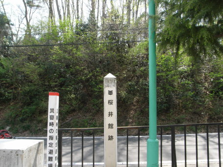| 桜井館跡碑と館跡(後背の丘)。 | |