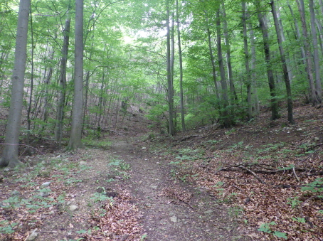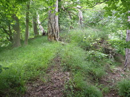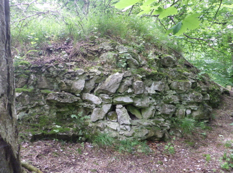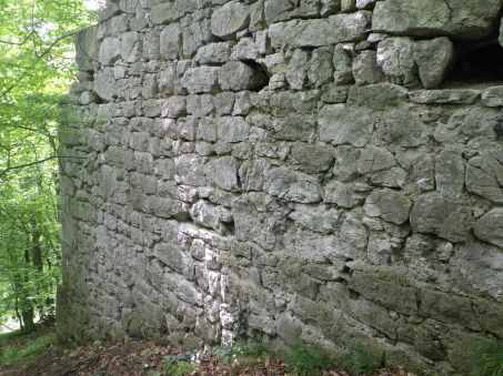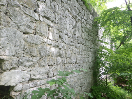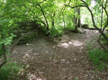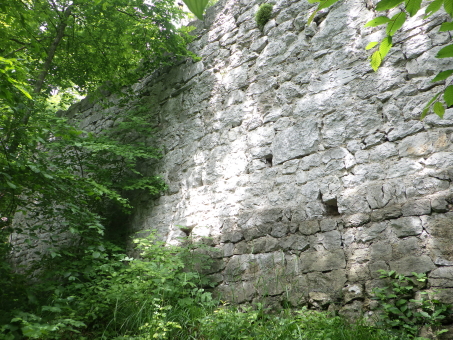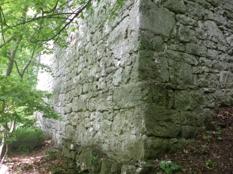 <沿革> 考古学の見地からは、1100年ごろに築かれ、13世紀には意図的に廃されていたとみられている。 わずか数百メートルの距離にあるラウエンシュタイン城やラウエネック城と同じ時期に、ハイリゲン クロイツへ抜けるヘレーネン谷の街道を押さえる目的で築城されたと考えられているが、史料上の 裏付けはない。また、ウィーン南東のマンナースドルフにも同名の城が存在するため、この期間の 文献にシャルフェネック城が登場したとしても、それがどちらを指すのかは留保が必要である。 1405年にフリードリヒ・フォン・シャルフェネックが城を所有していたとするのが、史料上の確実な 初出とされる。ただし、考古学的にはすでに廃城となっていたため、あくまで財産として城跡を保有 していたものと推測される。その後、経緯は不明だが、シャルフェネック城はラウエンシュタイン家の 手に帰した。 1476年、ウルリッヒ・カンパーなる人物がシャルフェネック城を入手し、カンパー・ツー・シャルフェ ネック家を称して貴族の一員となった。1517年には、婚姻により城はラウエンシュタイン家の所有に 復した。他方で、ラウエンシュタイン家はラウエンシュタイン城を失っている。 その後も城館として再び取り立てられることはなく、1595年時点で「荒城(ödes Schloss)」を表記 され、今日に至っている。 <手記> ラウエンシュタイン城とラウエネック城は今でもバーデンの町からちらほら見えますが、シャルフェ ネック城はそこからシュヴェヒャート川をさらに数百メートル遡った山中にあります。上述のとおり、 史料にもろくに見られず、麓の川沿いの遊歩道にはいわゆるベートーヴェンの散歩道として人の姿 も少なくありませんが、案内も標識もなく城跡があることすらまったく知られていない様子です。 私自身、バーデンへ来る前にペルヒトルツドルフ城の防御塔資料館で受付の博識な方に行き方 を教わっていなかったら、おそらく辿り着けなかったでしょう。というのも、森の中のカフェレストラン から庭角を曲がって藪道に入るのですが、いったん城跡と反対方向へ向かうため、事前の情報が なければこの時点で道を誤ったと引き返してしまったと思うのです。偶然の出会いによって訪れる ことができて、件の受付の方には本当に感謝です。 さらに、城跡への山道は途中で完全に埋もれ、藪を漕いで倒木を乗り越えなければなりません。 ここでも、その先に城跡があると分かっていなければ、断念してしまった可能性は高いでしょう。 こうして日本の山城と何ら変わらない労力の先に、まず鞍部の堀切が現れます。堀切は2本ある ように見えますが、ヨーロッパでは二重堀切というのは珍しいため、本当に遺構かどうかは留保が 必要かもしれません。 城内はほとんど自然地形に帰しており、部分的に建物基部の石塁が散見されます。と、城山の 南東側面に下りると、突如として一番の見どころである立派な石垣が現れ、ここまでの苦労が一気 に吹き飛びました。石垣の角には算木積みのような隅石もみられ、埋もれた廃墟ではありますが、 このサイトを訪問されるような百戦錬磨の城跡ファンの方でしたら畢竟満足されることでしょう。 シャルフェネック城は13世紀には廃されていたとされ、規模的にも他の2城よりはだいぶ小規模と いえます。おそらく、3城すべてにランニングコストをかけるよりも、2城を拡張して運用した方が効率 が良いと判断されたものと推察されます。 |