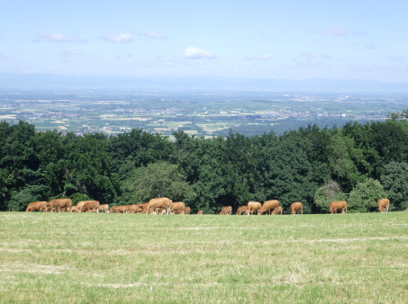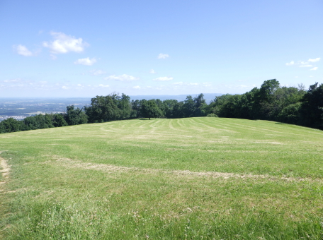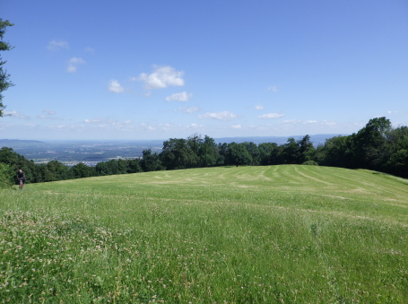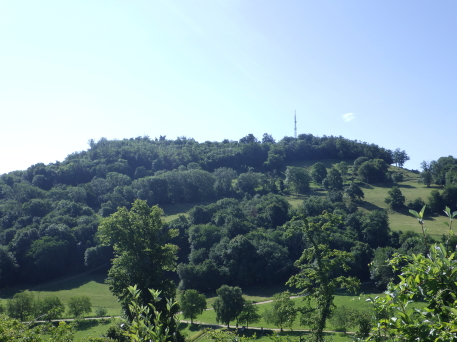 <沿革> 1344年の文書に「Burg ze obhusen(オプフーゼンの城)」という記述があり、東麓のアーウとの 関連が指摘されている。アーウ城には在地領主としてアーウ家があったとされ、また14世紀には シュネブリン・フォン・ベルンラップ家がシェーンベルクを含む広大な領土を所有していたが、彼ら との関係についても定かでない。 <手記> フライブルク市街の南西にゆったりとした双子の山があり、その最高所がシェーンベルクです。 麓からの比高は400m近くありますが、周囲から登山道が付いており、中腹では牛が放牧されて いるなど、のどかなハイキングが楽しめます。シェーンベルク(直訳すれば美山)の名の通り眺め もよく、山頂では私のほかに登山者と自転車の人がいました。 城跡であるという確たる証拠はないようですが、鉄の鏃や槍の穂先、北西のシュネーブルク城 と同時代の生活遺物、そして石造の建物がこれまで検出されているそうです。とくに建物は斜面 に接して立地しており、通常の家屋などとしては不自然なことから、城館があった傍証の一つに 挙げられています。とはいえ、あくまで城館の存在が指摘できる可能性地にとどまっており、地表 には城跡に結び付くようなものは何もありません。 都市部でもない限り、石造の城が完全に消滅することはほとんどないように思われるヨーロッパ で、日本のように存在した可能性が示唆されるだけの城跡があるというのは、なんとも興味深く 感じます。 |