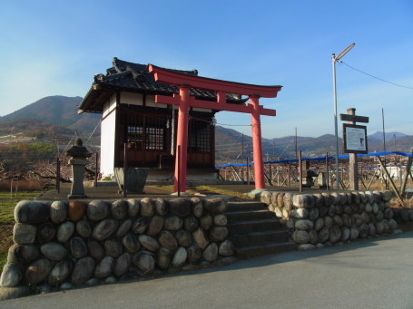 <沿革> 宝暦十二年(1762)、将軍徳川家重の次男重好が御三卿の1つ清水家を興すと、翌 十三年(1763)に甲斐国内の所領統治のために下岩下村に陣屋が築かれた。 寛政七年(1795)、重好は嗣子なく没し、清水家領は幕府に収公された。これにより、 下岩下の陣屋は廃され、代官業務は天領代官所である石和陣屋に移された。清水家 は寛政十年(1798)に再興されたが、下岩下の陣屋が再建されることはなかった。 <手記> 果樹園の中にひっそりと建つ稲荷神社の周辺が陣屋跡とされ、説明板が設置されて います。陣屋ですのでとくに遺構は認められず、どの程度の範囲が敷地だったのかも 分かりません。 同じブロック内には戦国時代に信虎誕生屋敷(岩下氏館)があったとされています。 |