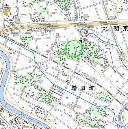 <沿革> 『中世城館調査報告書集成』によれば、北爪氏の館跡とされる。箕輪城主長野氏の家臣に 北爪姓の人物がみられるが、北爪氏について詳細は不明である。 また、荒砥川対岸の新土塚城の城主増田繁政との関連も考えられるが、確証はない。繁政 は由良(横瀬)氏家臣で、大胡城代を務めたとされる。 <手記> 下増田屋敷は、広瀬川と荒砥川に挟まれた下増田町の中心部に位置しています。屋敷跡の 北東隣に今宮八幡神社と蓮花院があり、『集成』では屋敷の鬼門鎮守とみているようです。 古地図によれば、屋敷は二重の堀に囲まれていたようです。内郭北西隅に土塁跡が見受け られますが、内郭全体が民家となっており、近づいて見ることはできません。 今宮八幡の西側から北西隅にかけて土塁と堀があります。おそらく神社も城域の一部として 取り込まれていたものと推測されます。この神社の土塁と堀が一番の遺構となっています。 |