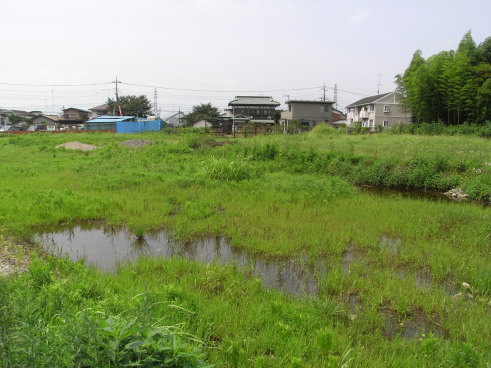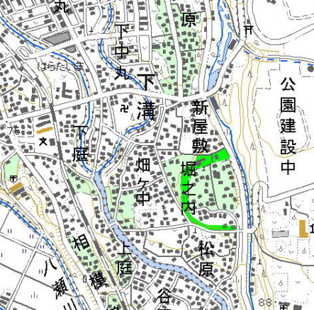 <沿革> 道保川と鳩川に挟まれた下溝村堀之内地区は、道保川に面した東側以外の三方を深田に囲まれていた。 昭和期にはすでに休耕田となっていたが、現在ではほとんどが埋められたり荒地となっている。 北条氏照の娘貞心尼は、北条氏家臣山中大炊助に嫁いだが、このとき下溝・上溝の両村が化粧田として 与えられたといわれる。下溝堀之内は、このときに築かれた屋敷跡とされる。また、このとき、貞心尼に付き 従って井上図書・井上三郎左衛門が下溝村に移住してきたと伝わる。今でも、堀之内地区には井上姓の家 が多い。 ただし、在郷領主の館としては広すぎるため、『日本城郭大系』では領主だけでなく関係集団の居住域で あったと推測している。 <手記> 堀之内地区を囲繞するような田の跡は、今なお地図上からも見て取ることができます。現在ではほとんど 埋められて駐車場や宅地になっていたり、一部は荒れて湿原のようになっています。 ただ、『大系』が指摘する通り、領主の館とするにはやや面積が広すぎるため、やはり環濠集落的なものと 考えるのが自然と思われます。あるいは、貞心尼の頃にそれまでの環濠を水田に変えたと考えることもでき ると思われます。 地区内も含め、周辺はかなり宅地化が進んでいますが、集落の立派な旧家は全て井上姓でした。 |