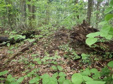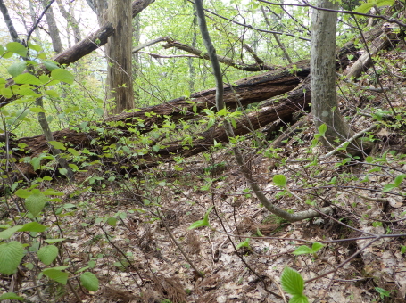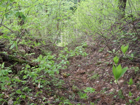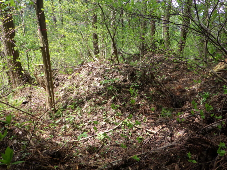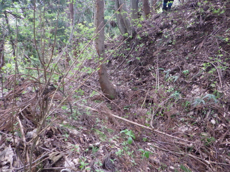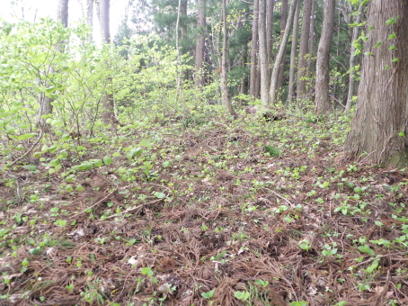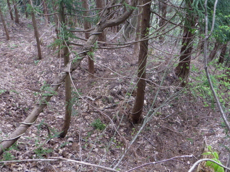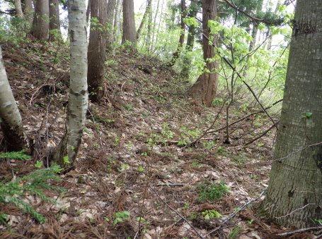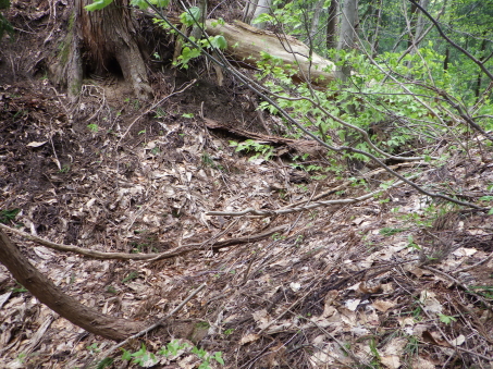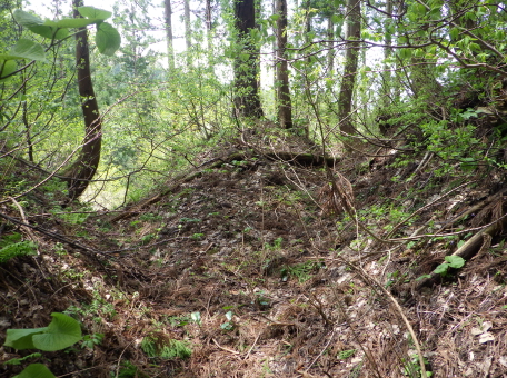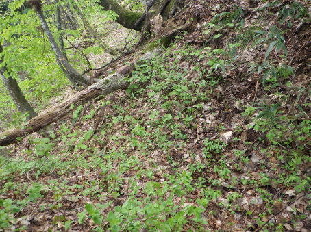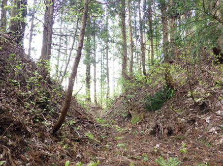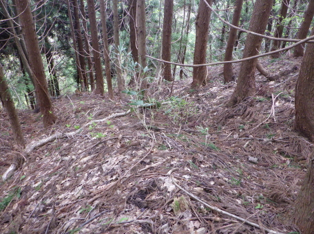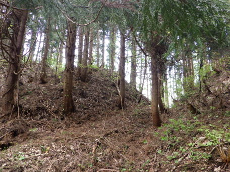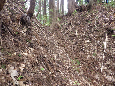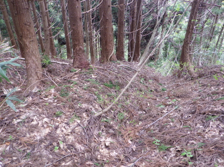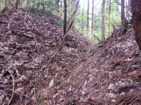 <沿革> 信濃守を名乗る人物の城館と推測されるが、史料にはみられず詳細は不明である。 <手記> 役内川左岸の山上に築かれた城です。上図にある通り、北東麓から林道が延びていて、 砂防ダムを越えた先も半ば藪化した作業道が背後の堀切下まで通じています。ただ、この 堀を見つけられずに勘で登ると、ロストしてしまう恐れがあります。この日は総勢10名以上 のオフ会で、我々は砂防ダムの先で北尾根に取りついて直登し、帰りは堀切から作業道へ 下りるルートを採りました。 しなの館の特徴は、何といっても主郭南東下斜面をびっしりと覆う畝状竪堀でしょう。主郭 までの道は藪ですが、城内は植樹林なので遺構が見やすいのも嬉しいポイントです。また、 背後には計5本もの堀切が穿たれ、1本目の堀切下に沿って主郭北西下斜面にも畝状竪堀 が設けられていました。到達難易度は高いものの、城内に入ってしまえば満足度マックスの 城跡です。 今でこそ役内川を遡っても宮城県の鬼首にしか出られませんが、かつては館南方の黒森 付近に有屋峠があり、院内峠と共に羽前・羽後往来の要衝でした。天正十四年(1586)五月 には小野寺氏と最上氏の間で有屋峠の戦いが勃発しており、しなの館をはじめ役内川沿い の諸城は、小野寺氏にとって対最上のマジノ線であったものと考えられます。 |