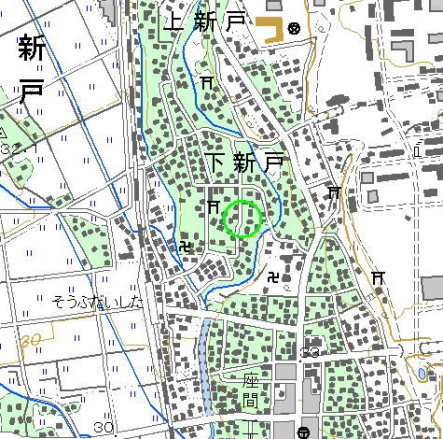 <沿革> 天正十八年(1590)、徳川家康は関東に移封となり、その家臣内藤清成は相模国大島・田名・ 当麻・新戸・座間宿の6ヶ村5千石を与えられた。清成は新戸村に陣屋を構え、その広さは二反 六畝あまり(約2600平方メートル)であったとされる。清成自身は奉行として江戸に詰めており、 陣屋に住むことはなかった。ちなみに、江戸の清成屋敷は現在の新宿御苑一帯の広大なもので、 その屋敷の眼前に新しく開かれた宿場(内藤新宿)が、現在の新宿の由来である。 関ヶ原の戦い後の慶長六年(1601)、清成は上総・下総・常陸国内に1万6千石を加増されて、 2万1千石の大名となった。ただ、大名に列した後も新たに城を築いたわけでもなく、さりとて新戸 陣屋を藩府としたわけでもないようである。清成の子清次は、はじめ父とは別に常陸国に5千石を 与えられていたが、父の死後家督を継ぐと、遺領と併せて2万6千石となった。 藩府が定まるのは次の清政の代のことである。元和八年(1622)、清政は4千石加増のうえ安房 へ移され、安房勝山藩が成立した。 その後も陣屋は使用されていたようだが、元禄十三年(1700)、忍藩阿部氏の領地となっていた ときに廃されたとされる。なお、『新編武蔵風土記稿』にはこのときの領主を阿部正喬としているが、 当時の当主は正喬の父正武である。誤記なのか正喬が別に所領をもっていたのか、詳細は不明 である。 <手記> 相武台下駅近くの白山神社の東側に、「陣屋小路」と呼ばれる小道と字名が残っています。小道 の途中に、陣屋小路の標柱と稲荷社があります。この稲荷は陣屋の鬼門にあたるそうです。遺構 はとくにありません。 陣屋周辺は鳩川とその支脈に挟まれた台地の先端にありますが、陣屋ですのでさほどの要害性 は認められません。 |