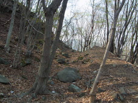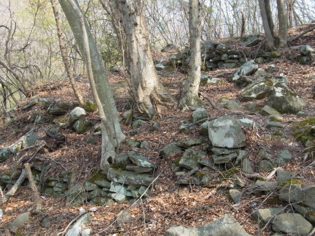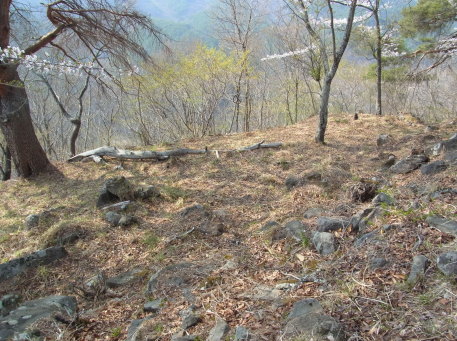 <沿革> 『甲斐国志』によれば、室町時代前期の甲斐守護武田信満の三男江草兵庫助信泰(信康) が拠ったとされる。他方、『巨摩郡江草村諸色名細帳』には、城主として「志田小太郎実高」 の名が、『甲斐国古城跡志』には「波木井殿」が挙げられている。後者については、同書の 谷戸城の項に「城主信田小太郎」とあることから、『日本城郭大系』では獅子吼城主と取り 違えたものとみている。獅子吼城下にある見性寺の縁起には、元応二年(1320)五月四日 に、「獅子頭の城」で討ち死にした信田小左衛門実正・小太郎実高父子の菩提を弔うため、 武田信武(信満の曽祖父)が翌元享元年(1321)に建立したのがはじまりとされ、その後、 一度建物が損壊したものを信泰が再興したとされる。 信田氏について詳細は不明だが、同時代に同じく「実」を通字とする南部氏の庶流に、 『甲斐国古城跡志』で獅子吼城主とされる波木井氏がある。したがって、信田氏も南部氏の 一族とも考えられるが、確証はない。信田氏が実在したとすれば、同氏が獅子吼城の築城 者であり、原因は不明だが同氏が断絶したために、信泰が遺領を継いだものと推測される。 信泰が死ぬと、遺領は信泰の弟今井信景の子信経が継いだとされる。信経の子の信乂・ 信慶兄弟はそれぞれに家を興し、獅子吼城は信慶の居城となった。信慶の系統は浦殿と 呼ばれたが、これは信乂の系統を「表」としたことに対するものともいわれる。 応永十七年(1417)に、上杉禅秀の乱に加担した信満が追討を受けて自害すると、甲斐 では国人衆の影響力が強まり、内乱状態が断続的に続いた。府中(表)今井氏が守護家 に従順であったのに対し、浦今井氏はしばしば武田宗家に反抗を企てた。とくに、15世紀 末に油川信恵の乱が起こると自立傾向を強め、信恵の甥信直(後の信虎)が宗家を継ぐと、 信慶の子信是(浦兵庫)は叛意を明確にした。信恵は永正五年(1508)に信直に討ち取ら れたが、信是は今川氏や諏訪氏の支援を受けて抵抗を続けた。『高白斎日記』の翌永正 六年(1509)十月二十三日の項に、「小尾弥十郎江草城ヲ乗取」とある。『大系』では、この 江草城を獅子吼城とみなしているが、城乗っ取りの詳細については不明である。 享禄四年(1531)三月、河原辺の戦いで信是の子信元ら反信虎連合軍は大敗し、国人 衆による組織的な抵抗は潰えた。しかし、信元はなおも「浦ノ城(『妙法寺記』)」に籠って 敵対を続けた。この浦城は獅子吼城を指すとされているが、異説もある。同年九月、信元 は信虎に降伏した。一般的には、これをもって信虎の甲斐国内統一としている。 天正十八年(1582)の天正壬午の乱に際し、北条勢が「江草小屋」に入ったが、これも 獅子吼城を指すとされる。この間の、武田氏支配下の獅子吼城については不明であるが、 「小屋」という表現から、城としては廃されていた可能性が考えられる。同年九月、徳川氏 についた津金衆・小尾衆らの武田遺臣や、服部正成(半蔵)率いる伊賀組が獅子吼城に 夜襲をかけ、落城させたとされる。獅子吼城の陥落は、北条氏にとって兵站が脅かされる ことを意味し、甲斐での徳川氏優位を決定づけたといわれる。同年十月に両氏の間で和議 が結ばれ、獅子吼城は廃城となったものと思われる。 <手記> 獅子吼城山は、『大系』によれば「江草富士」とも呼ばれるということで、たしかに峰続き の東側を除けば、きれいな円錐形をしています。眼下の塩川の谷間には、かつて穂坂路 と呼ばれる街道が走り、信州峠を越えて佐久へと通じていました。この穂坂路は、古くは 重要な信州往還の1つだったそうで、この道を扼する獅子吼城は、相当な要衝であったと 推測されます。この街道を完全に封鎖できてしまうという立ち位置が、浦今井氏の独立性 の高さにつながったとしても不思議ではありません。 現在、城跡へは尾根続きの東側の付け根まで新しく林道が作られており、そこから問題 なく城内へ入ることができます。おそらく再後背の土橋だったと思われる道の付け根に、 説明板が設置されています。 細尾根沿いに、堀切や竪堀をいくつか越えると、大手口と思われる虎口に辿りつきます。 大手道は、城山を北麓から山肌に沿ってぐるっと回ってこの大手口に至っているようで、 今もその道筋は残っています。そして、この虎口は、せり出した土塁をさらにU字にカーブ して城内に進入するようになっており、獅子吼城でもっとも技巧的な縄張りとなっています。 虎口を抜けると、先の土塁と山肌に挟まれた横堀状の空間をしばし進みます。そして、 そこから先は頂上まで削平地群が続きます。獅子吼城の特徴は、なんといっても削平地 群をびっしりと覆う石積みと削られた露岩です。この石積みは、削平の際に砕いた岩石を ただ積んだもののようで、(いわゆる裏込めをともなう)石垣ではないようです。とにかく岩を 砕いてスペースを作ったという感じで、どこまでが削平地なのか不明瞭な場所も多々あり ます。