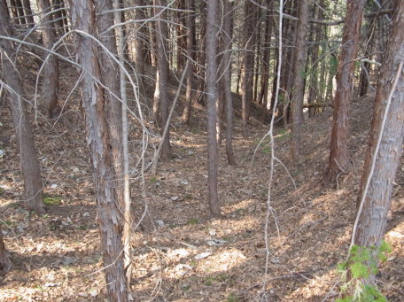 | 大手口か。 右手前から左手をU字カーブして中央土塁向こう側に抜ける。 |